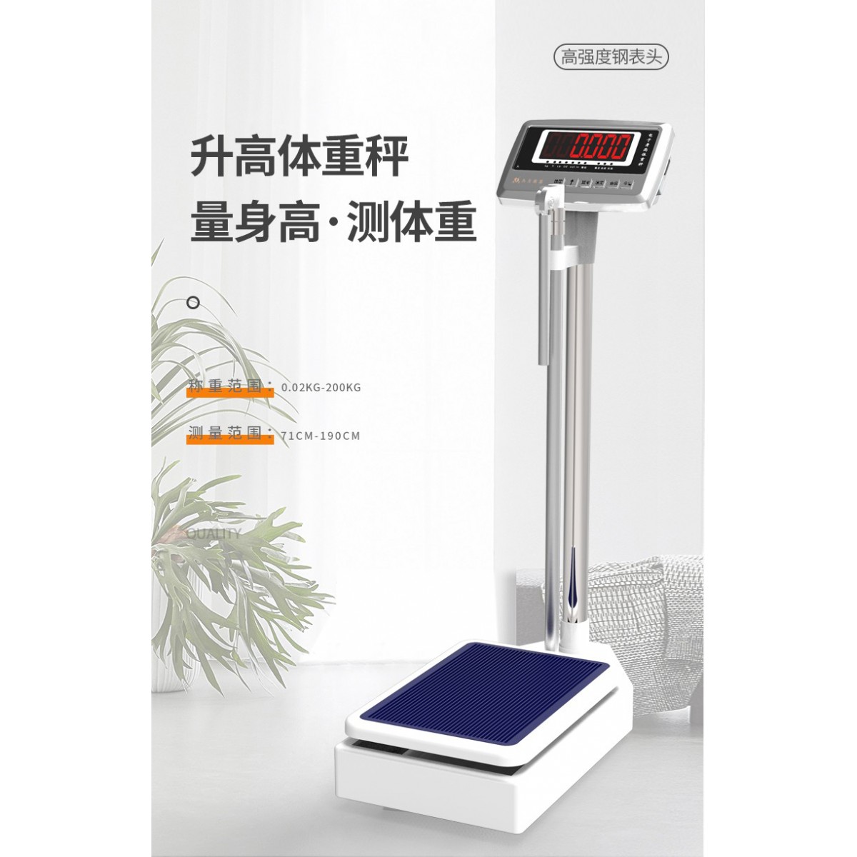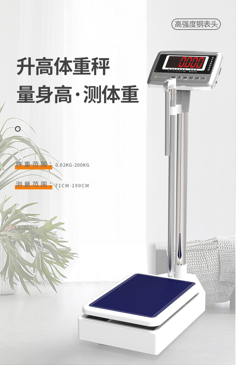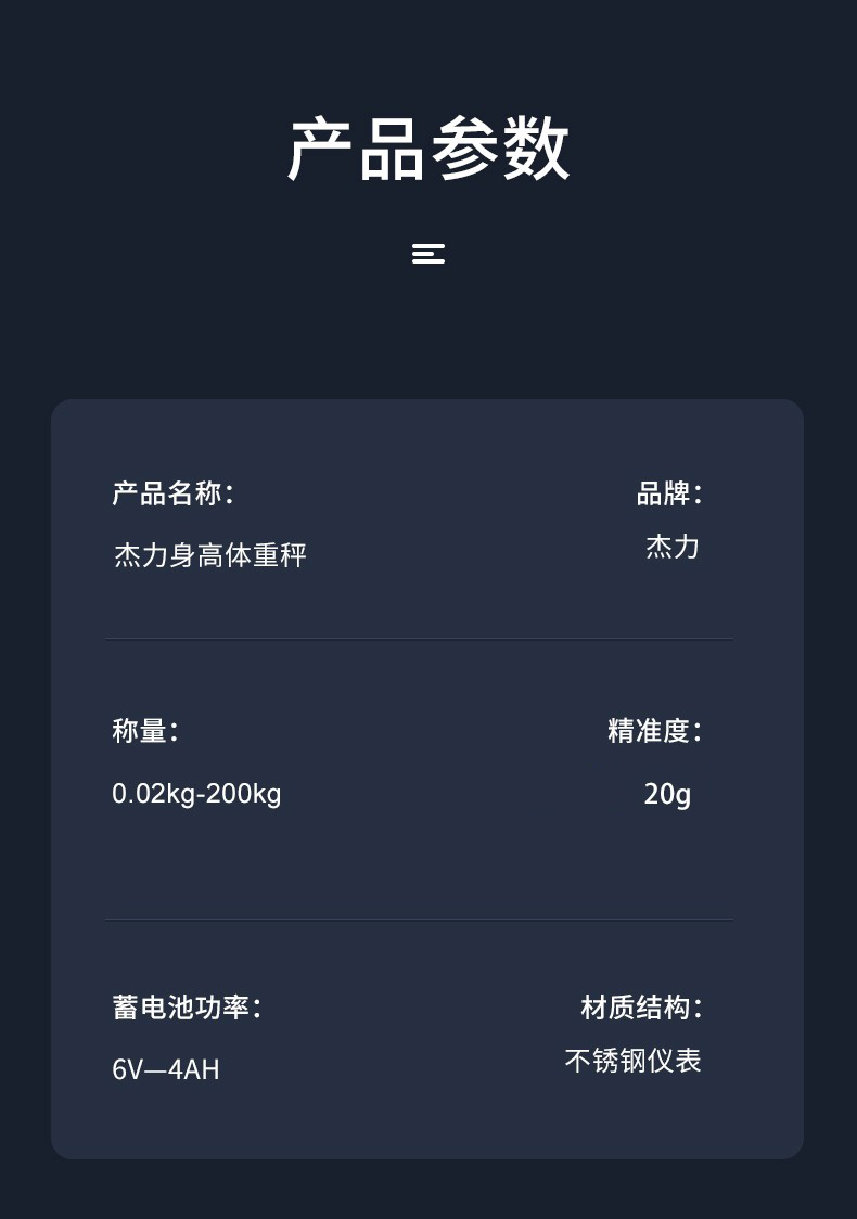 商品名称:杰力身高体重秤 不锈钢按键 硅胶防滑垫 20克分度值 电池款 200kg 单位:台