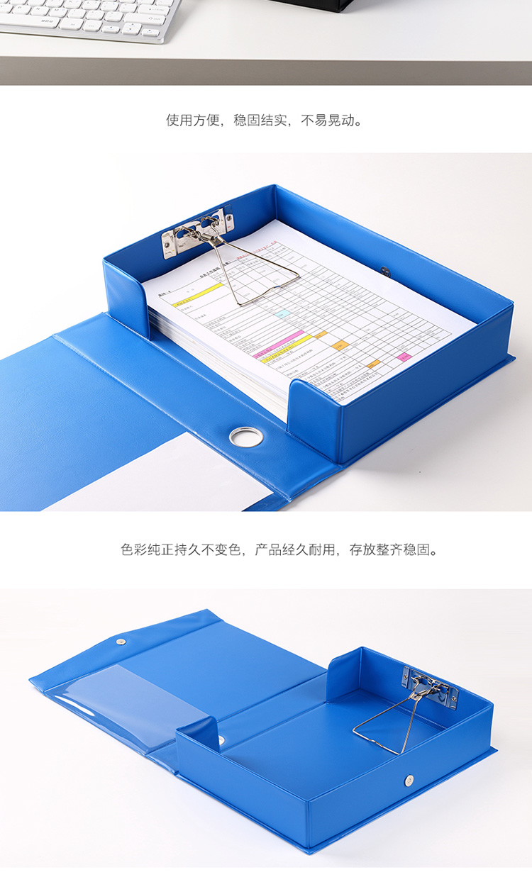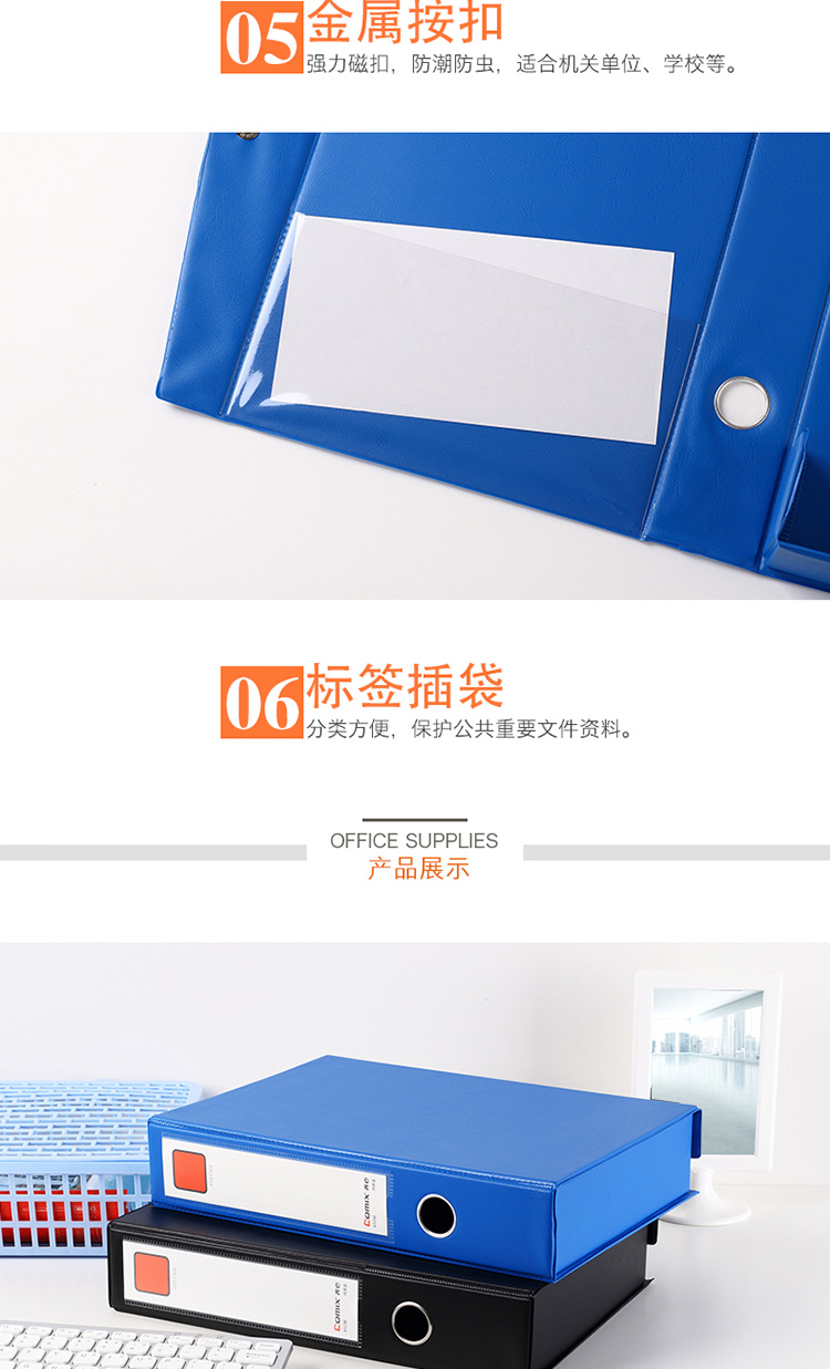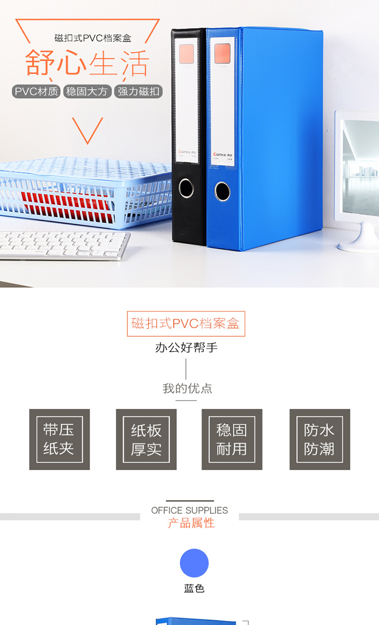 商品名称:齐心A1236磁扣式档案盒A4 55mm(带压纸夹) 蓝色 14个/箱