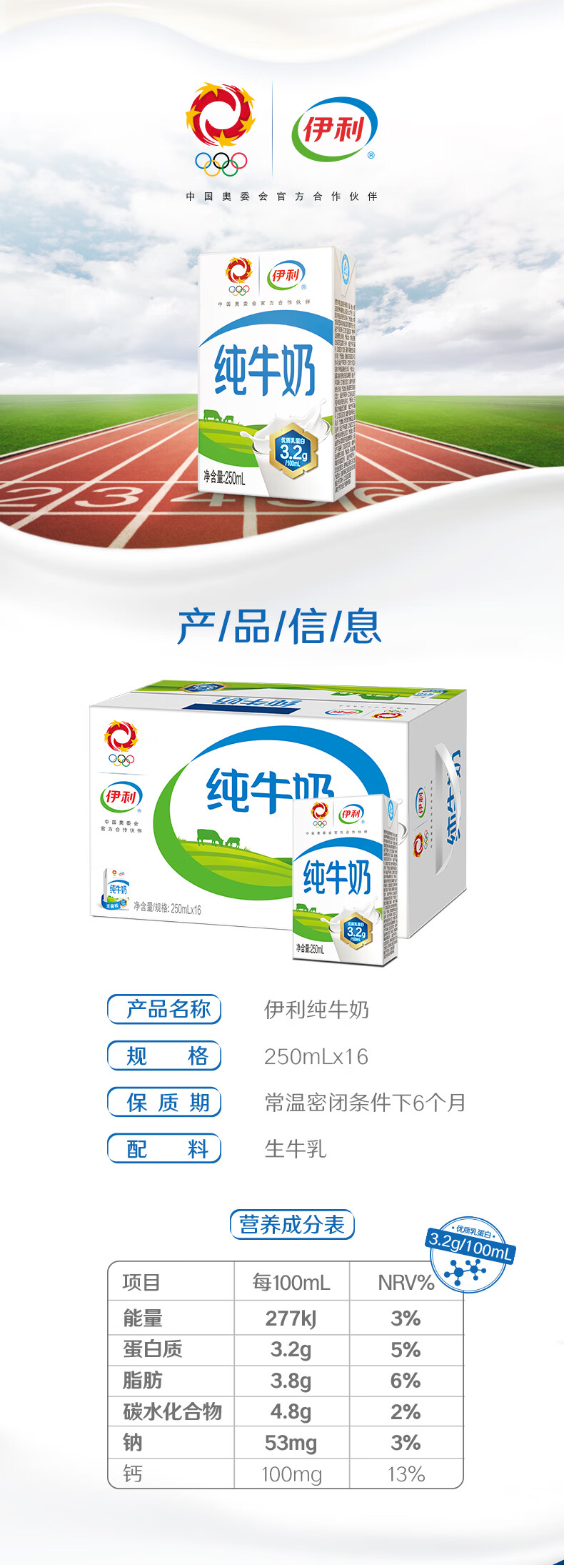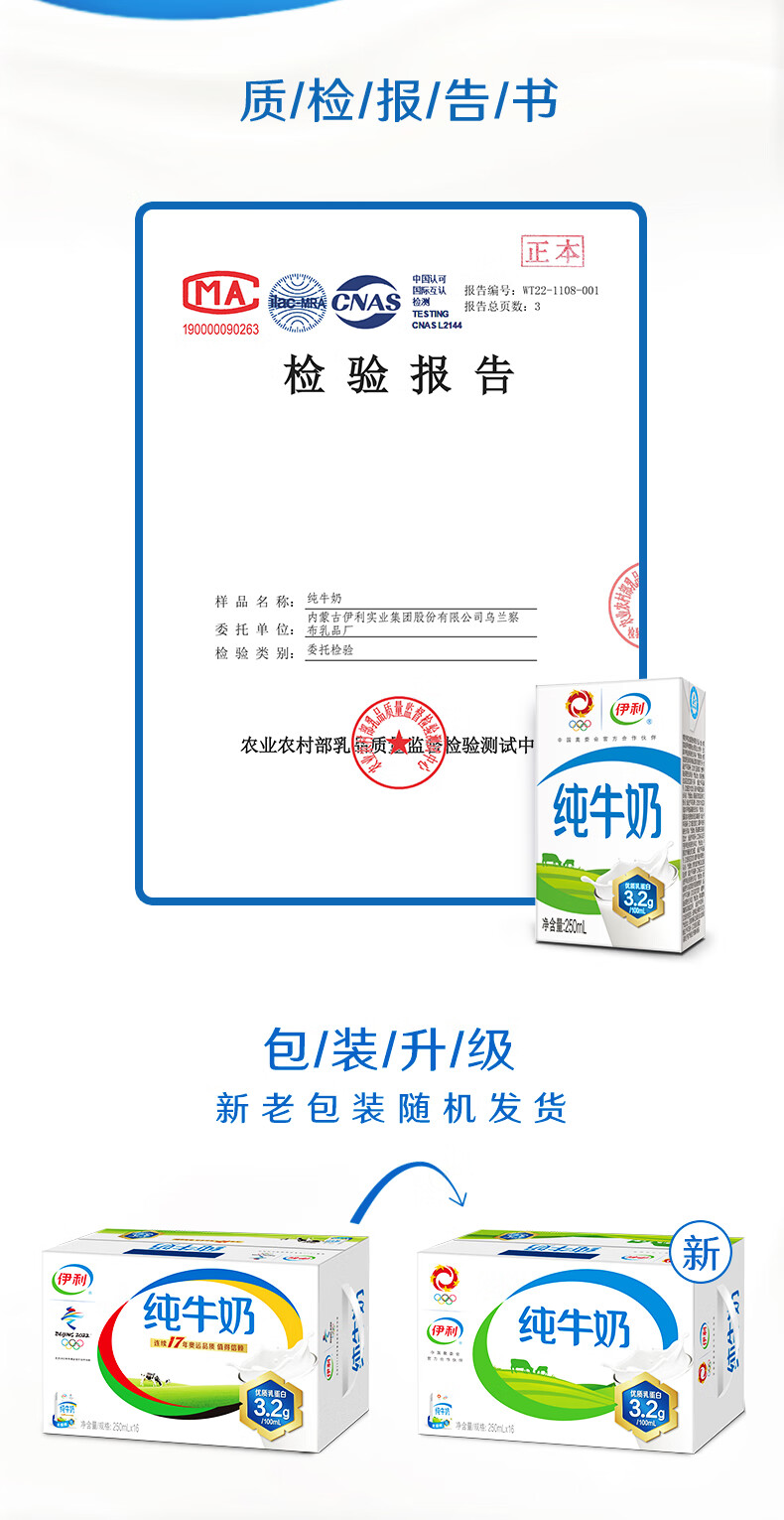 商品名称:伊利纯牛奶 250ml/盒 16盒/箱 单位:箱