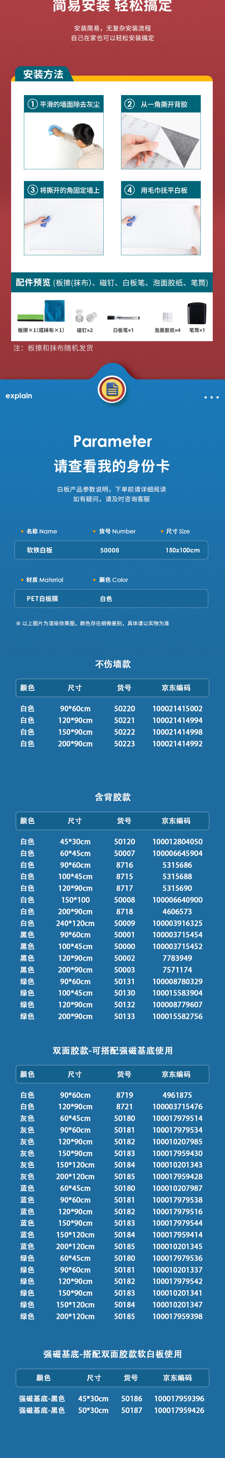 商品名称:得力50008软铁白板1500*1000*0.5mm 带胶 白色 单位:块
