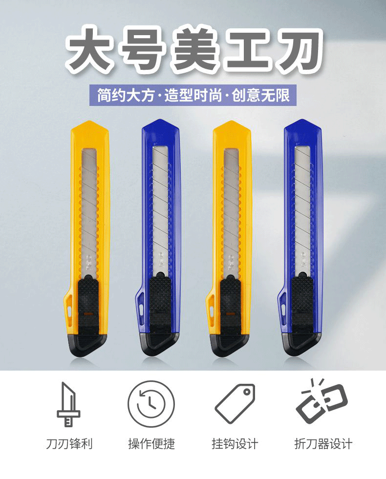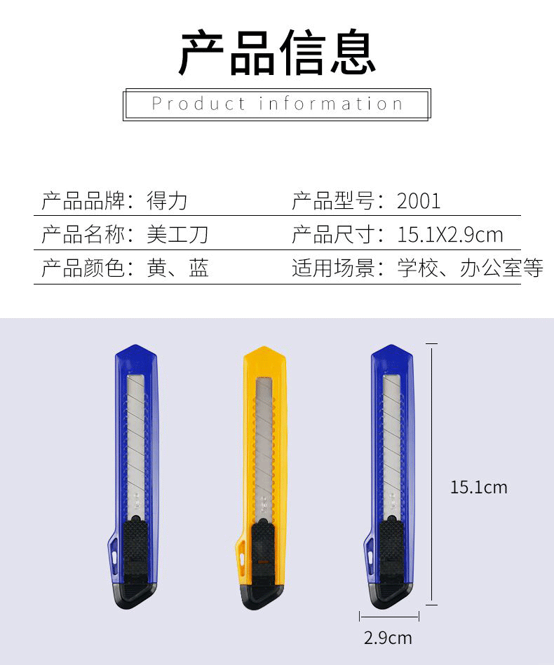 商品名称:得力2001美工刀 黄/蓝色 颜色随机 单位:把