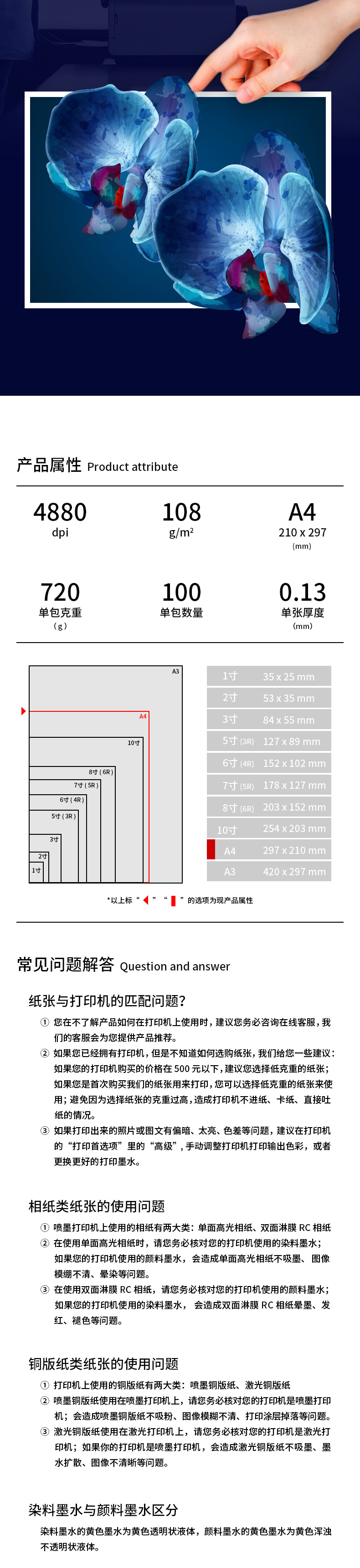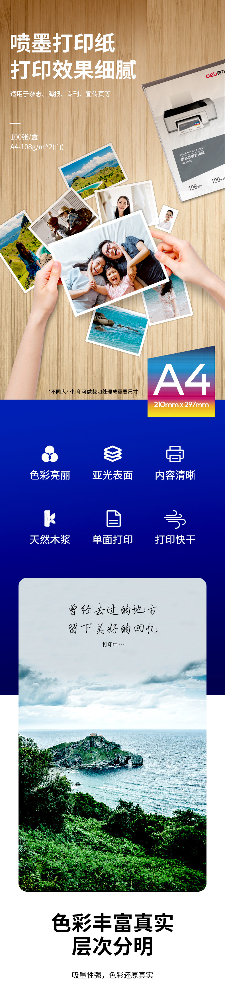 商品名称:得力11832喷墨打印纸A4 108g 白色 100张/包 单位:包