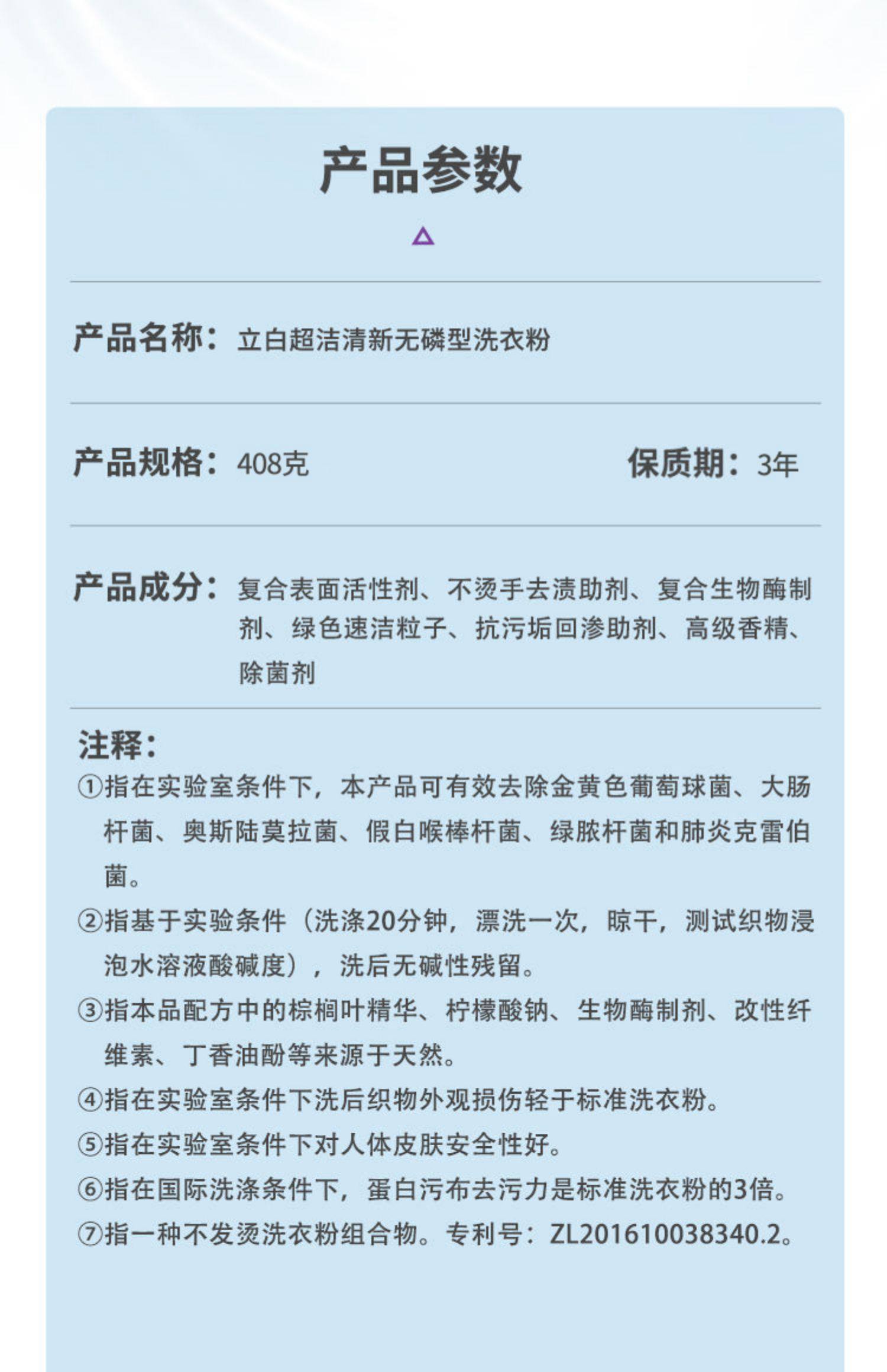 立白超洁清新洗衣粉 408g 无磷 16包/件 单位:包