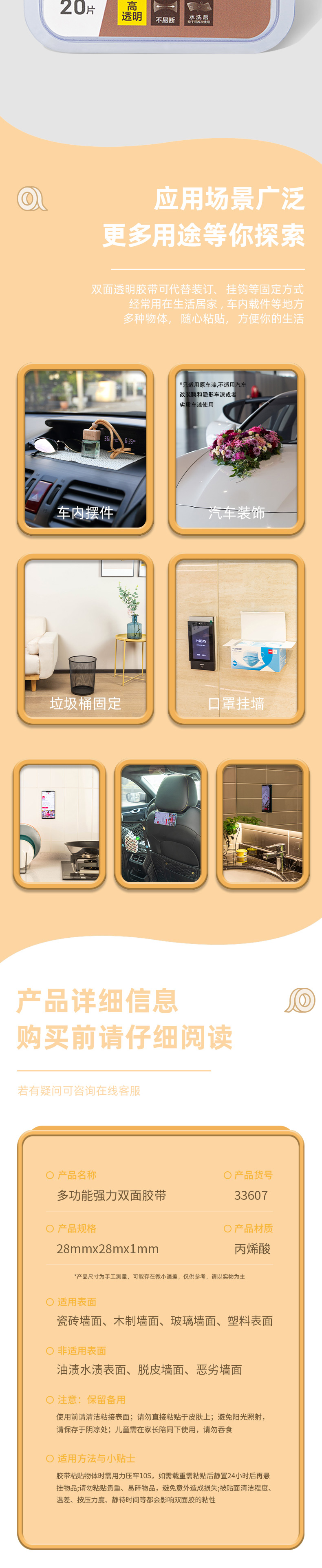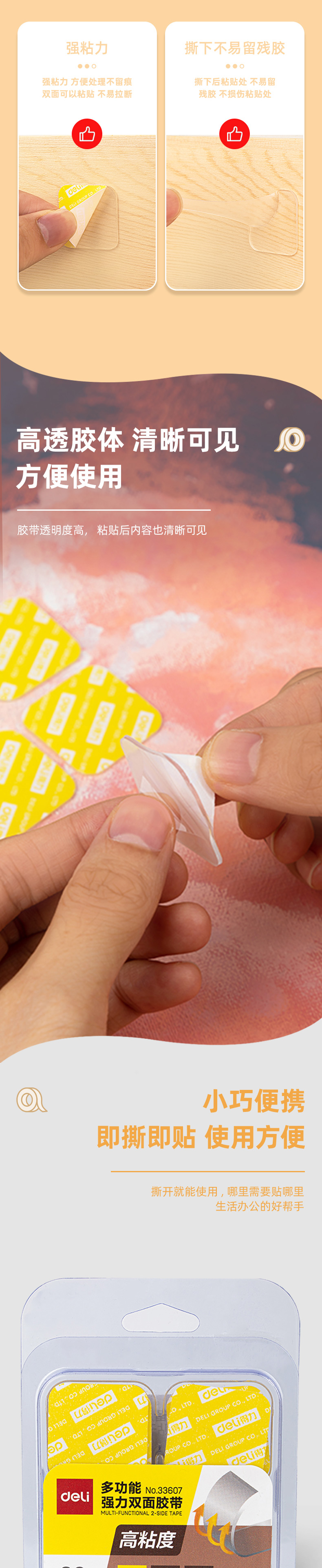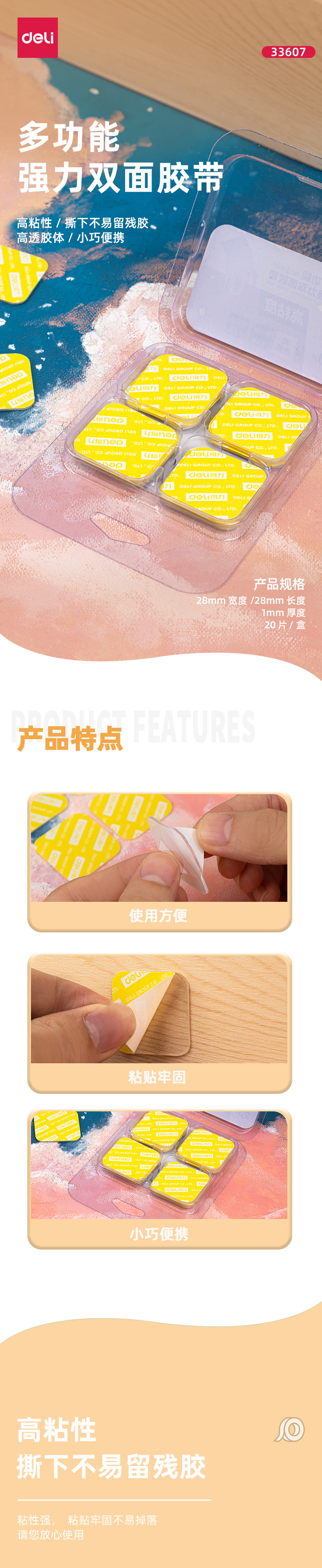 商品名称:得力33607双面透明胶带 28mm*28mm*1mm 透明 20片/盒 单位:盒