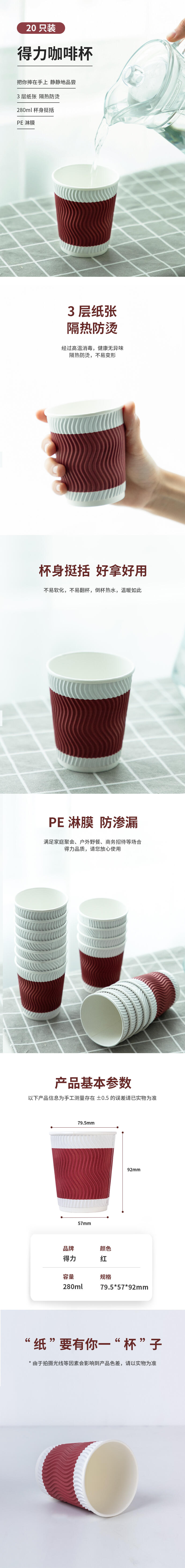 商品名称:得力19206双层纸杯 红色 280ml 20只/包 单位:包