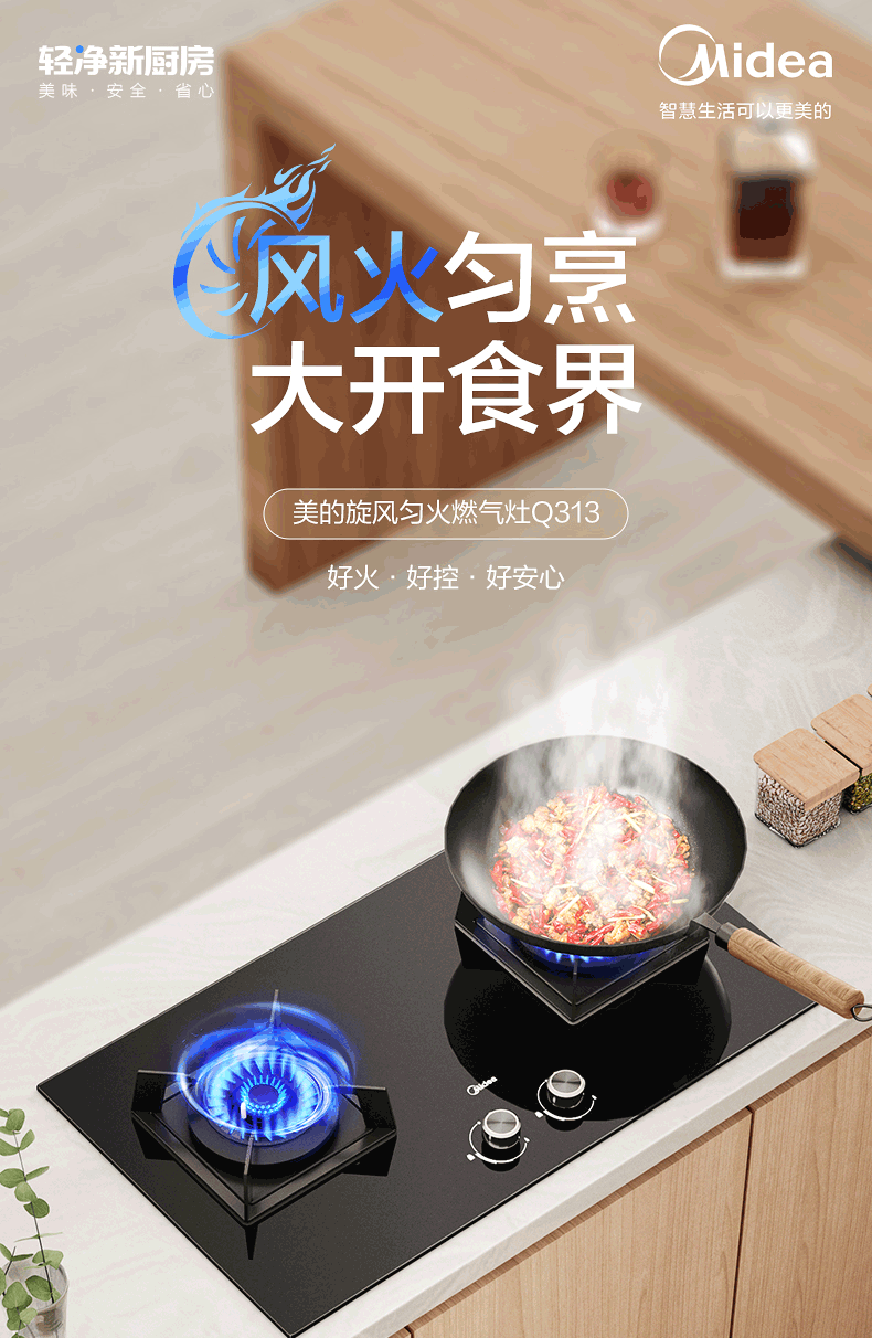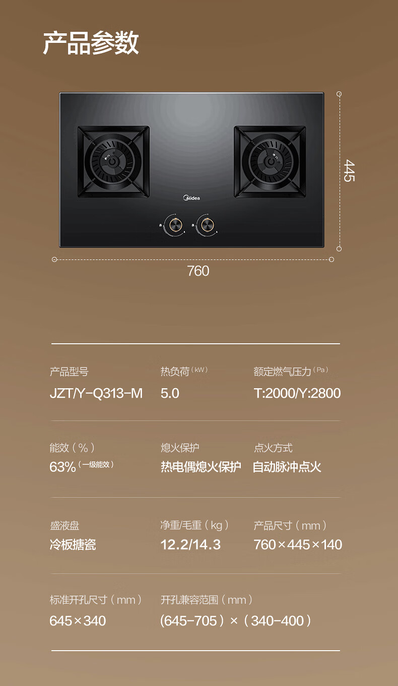 商品名称:美的JZT/Y-Q313-M燃气灶 双灶具 5.0kW 160mm大火盖 旋风匀火 单位:个