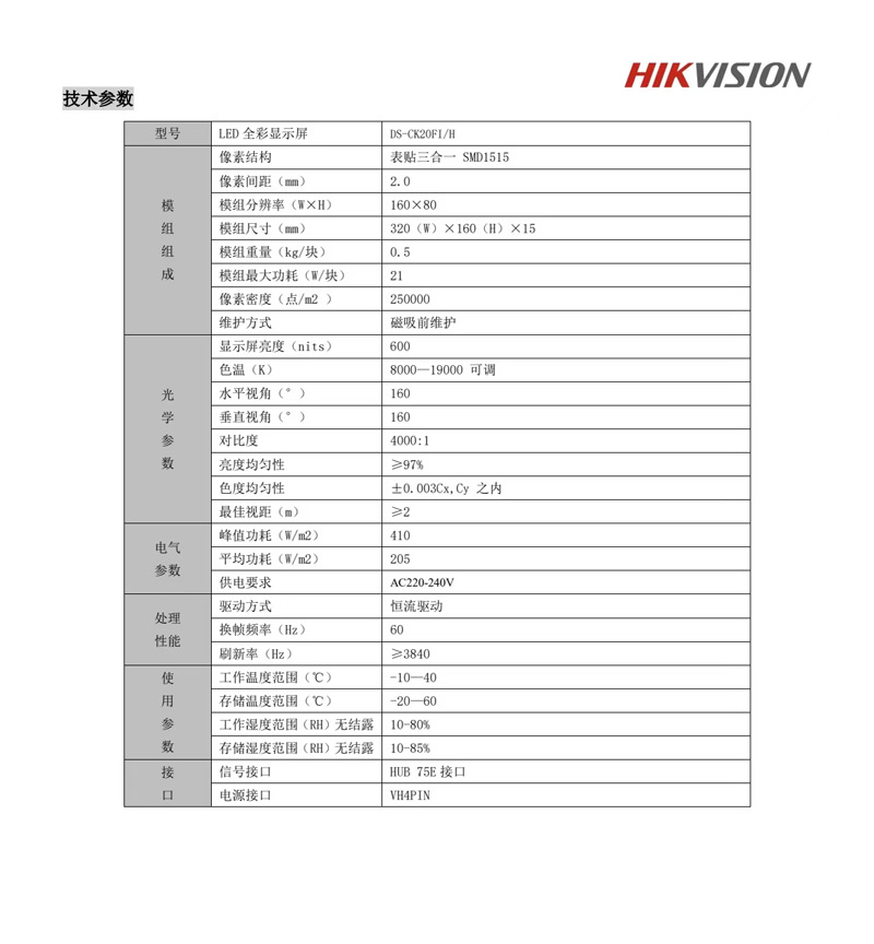 海康威视DS-CK20FI/H LED全彩显示屏13.824㎡ (含:接收系统、拼接处理器、电源、屏控制软件、支架、配电柜、工程线缆及安装调试)单位:套