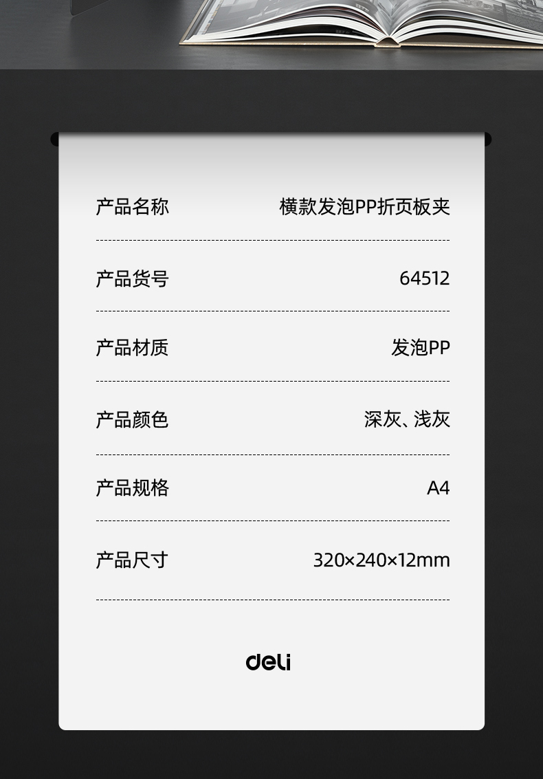 商品名称:得力64512横款发泡PP折页板夹 浅灰 单位:个