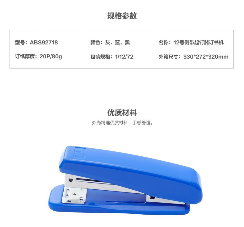 商品名称:晨光12号侧带起钉器订书机 (蓝色) ABS92718 单位:个