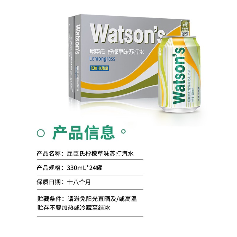 商品名称:屈臣氏柠檬草味苏打汽水330ml*24 单位:箱