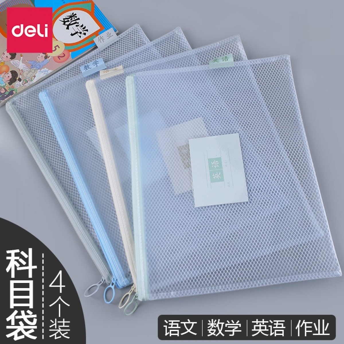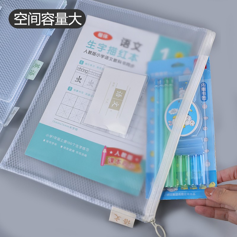 商品名称:得力72648学科拉链袋A4 (混色) 4个/包 单位:个
