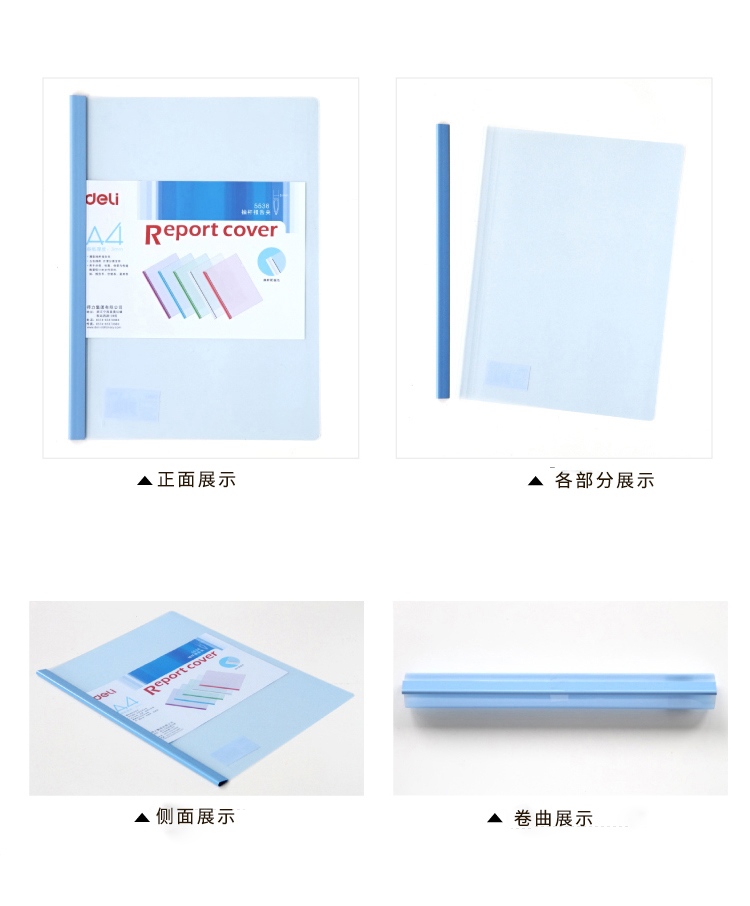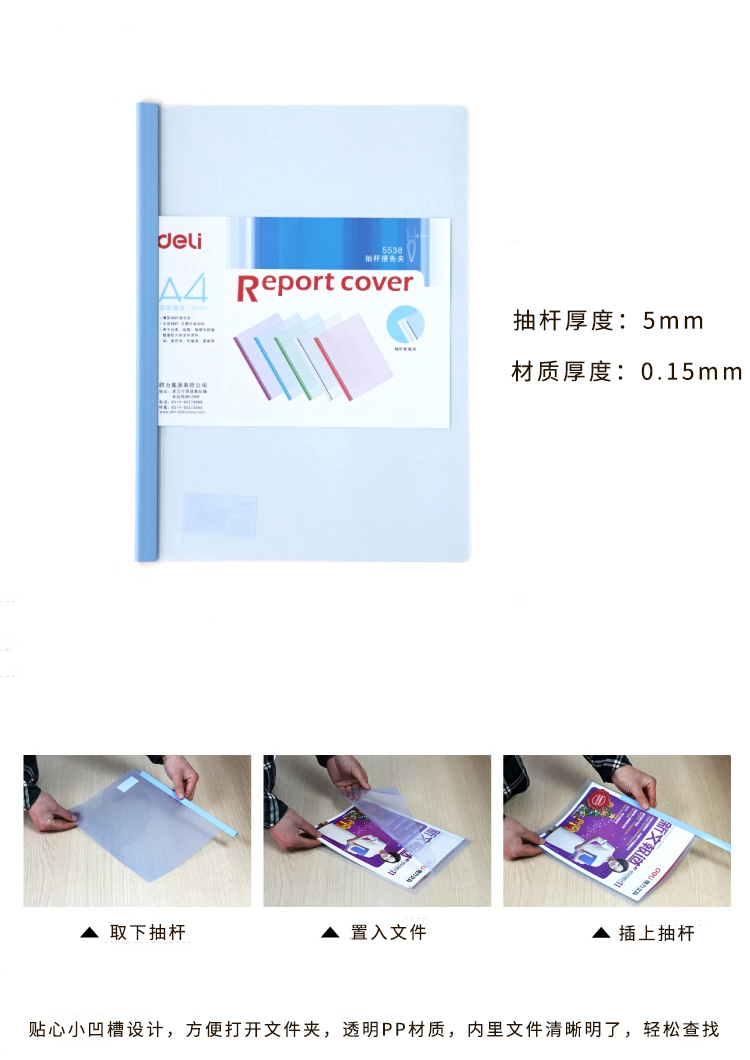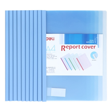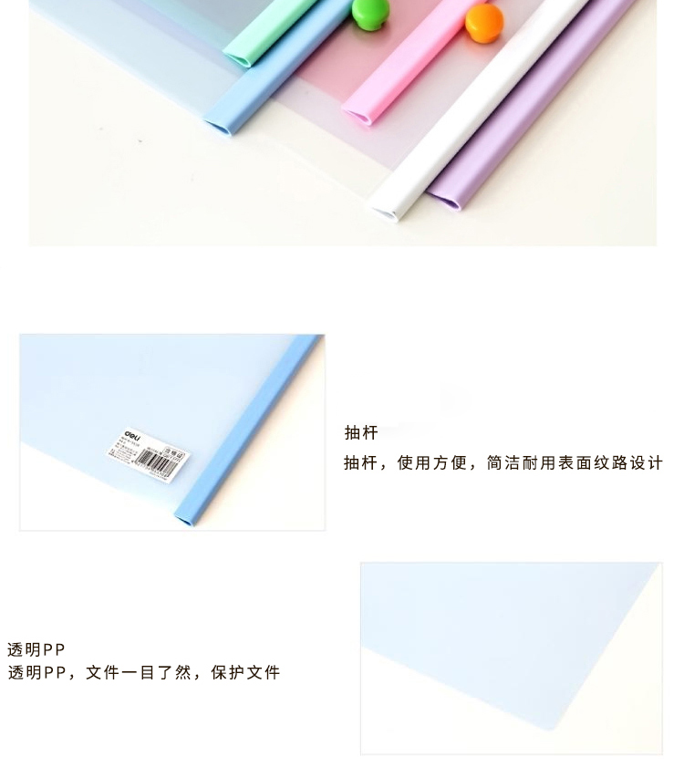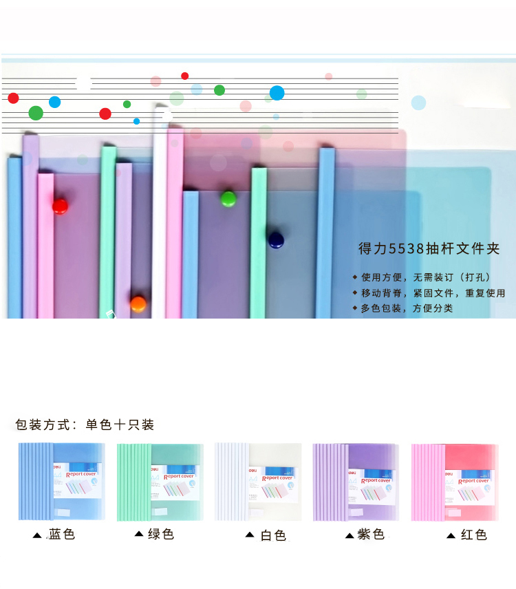 商品名称:得力(deli)10只A4彩色半透明抽杆文件夹报告夹拉杆夹 5色随机5538