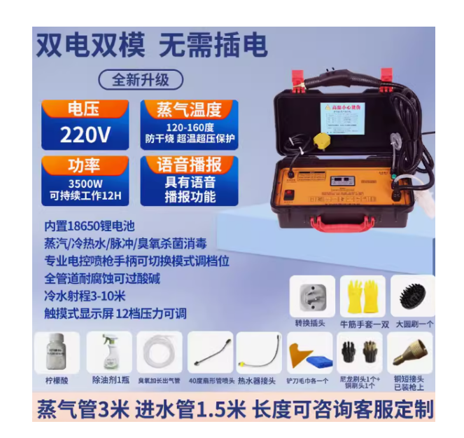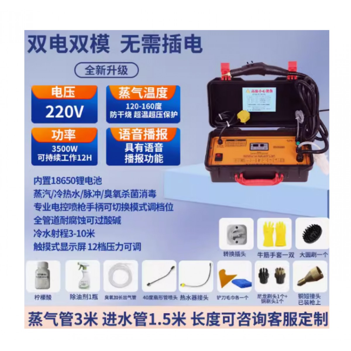 商品名称:高温蒸汽清洁机 3500W 蒸汽+高压冷热水+语音+双电源+脉冲臭氧 过酸碱 单位:台