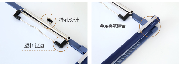 金属平夹:夹力强、不生锈,金属挂钩,可挂墙上;金属板夹边角以塑料包裹,所夹住的文件不会留下痕迹
