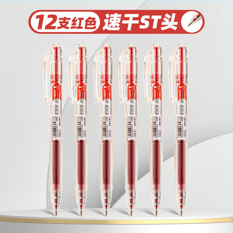 得力S08E红色圆珠笔 0.5mm 双珠透明杆 速干ST头 12支/盒