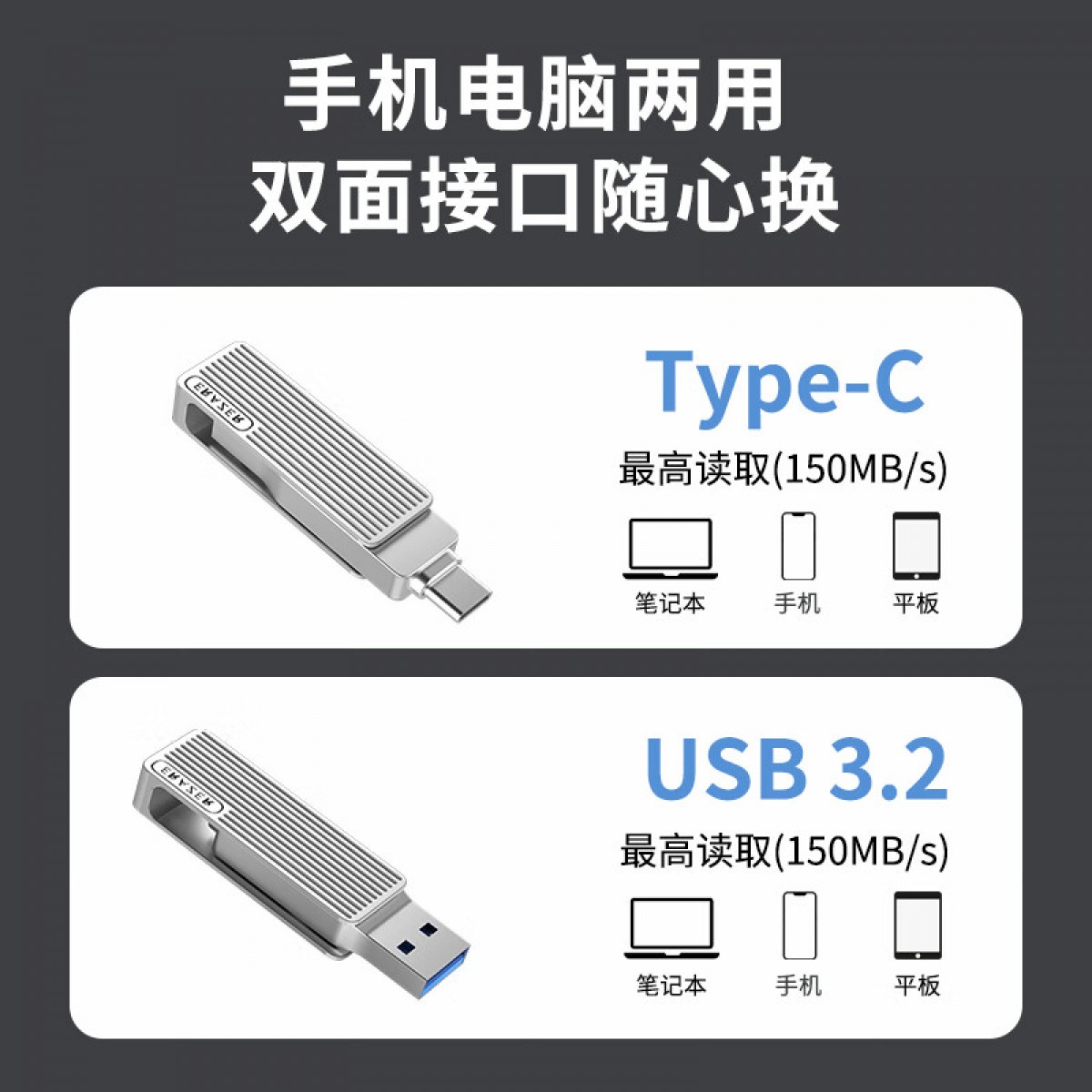 联想F500 U盘 异能者64GB Type-C USB3.2 读速150MB/s 手机电脑 双接口 银色