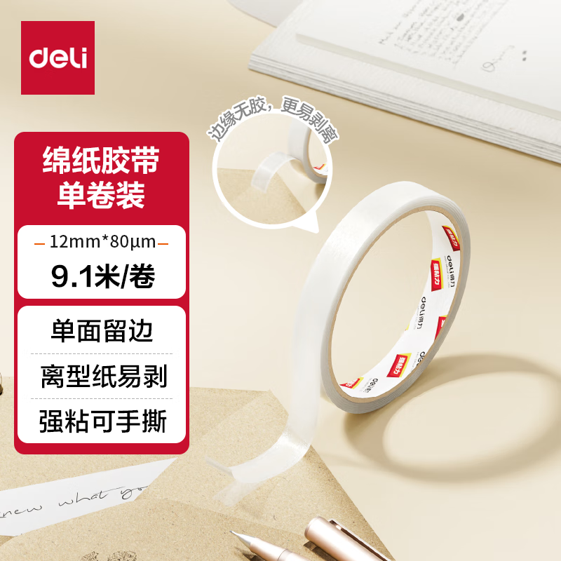 商品名称:得力JL405绵纸双面胶带 12mm*10y(9.1m/卷) 单位:卷
