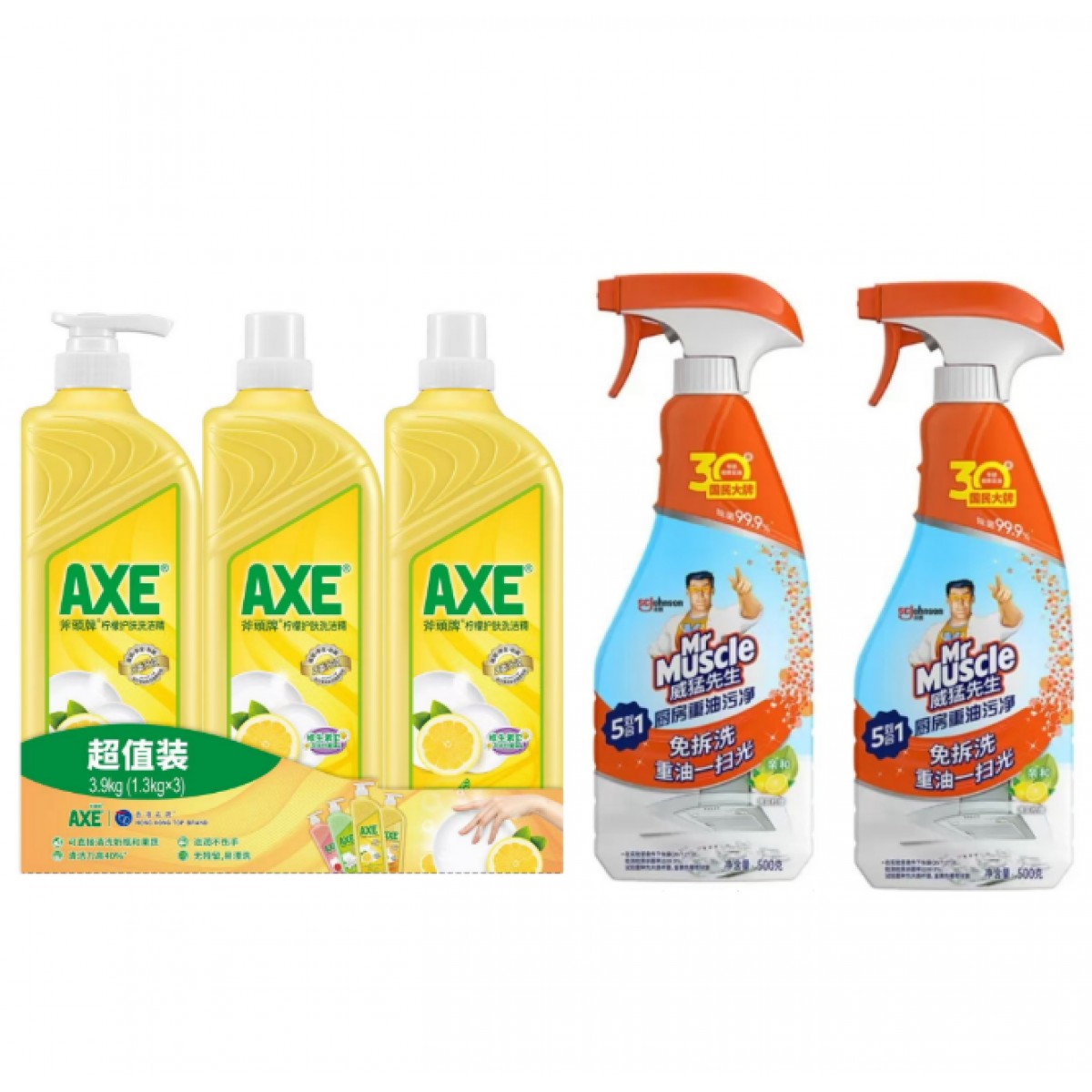 斧头牌洗洁精1.3kg*3+威猛先生厨房重油污净500g*2
