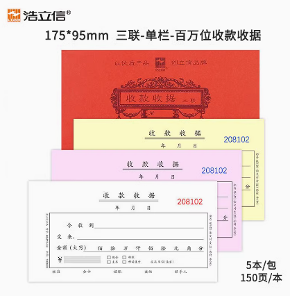 商品名称:浩立信3411收款收据 三联单栏 175*95mm 150页/本 5本/包 单位:本