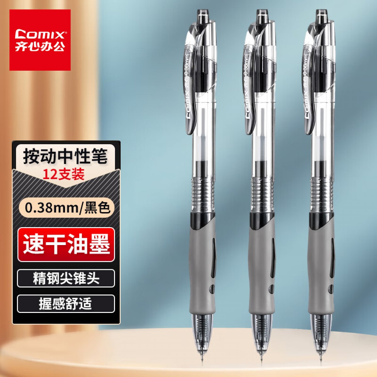 齐心GP138财务速干按动中性笔 ST精钢尖锥头 0.38mm 黑色 12支/盒 单位:盒
