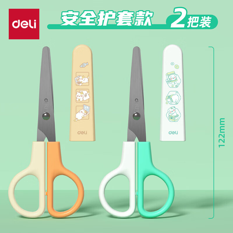 得力6021安全剪刀 两把装(橙+绿)透明护套