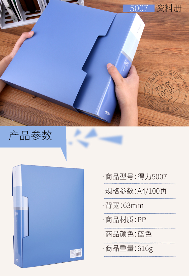 商品名称:得力(deli)5007 大容量A4/100页办公资料册 蓝色 单只装