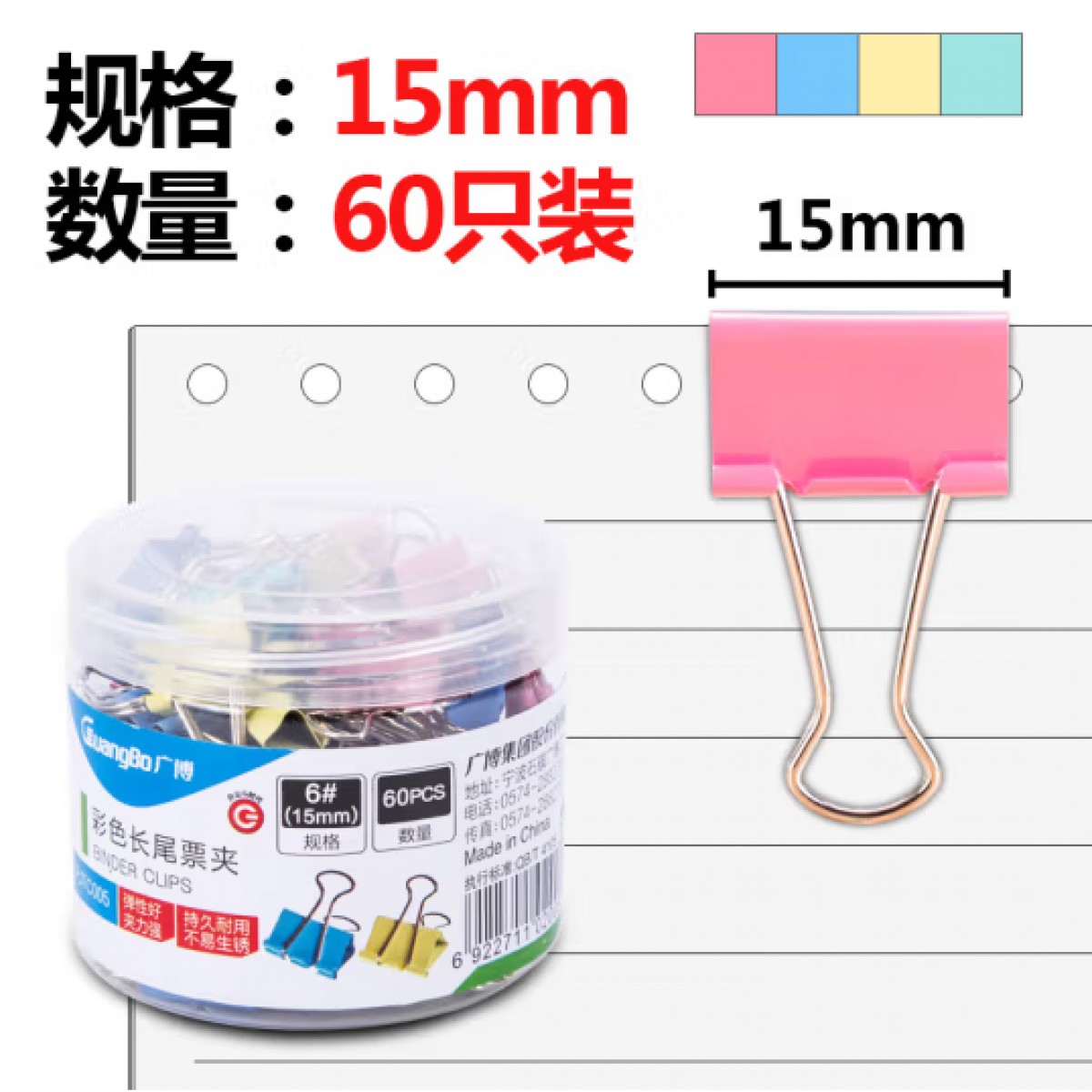 商品名称:广博PJTC005彩色长尾夹 60只装15mm 单位:筒