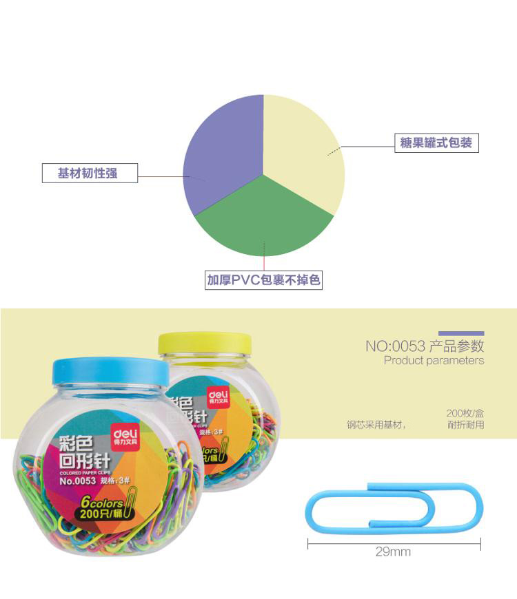 商品名称:得力(deli) 0053 3#镀镍时尚彩色防锈曲别针/回形针 200枚/筒