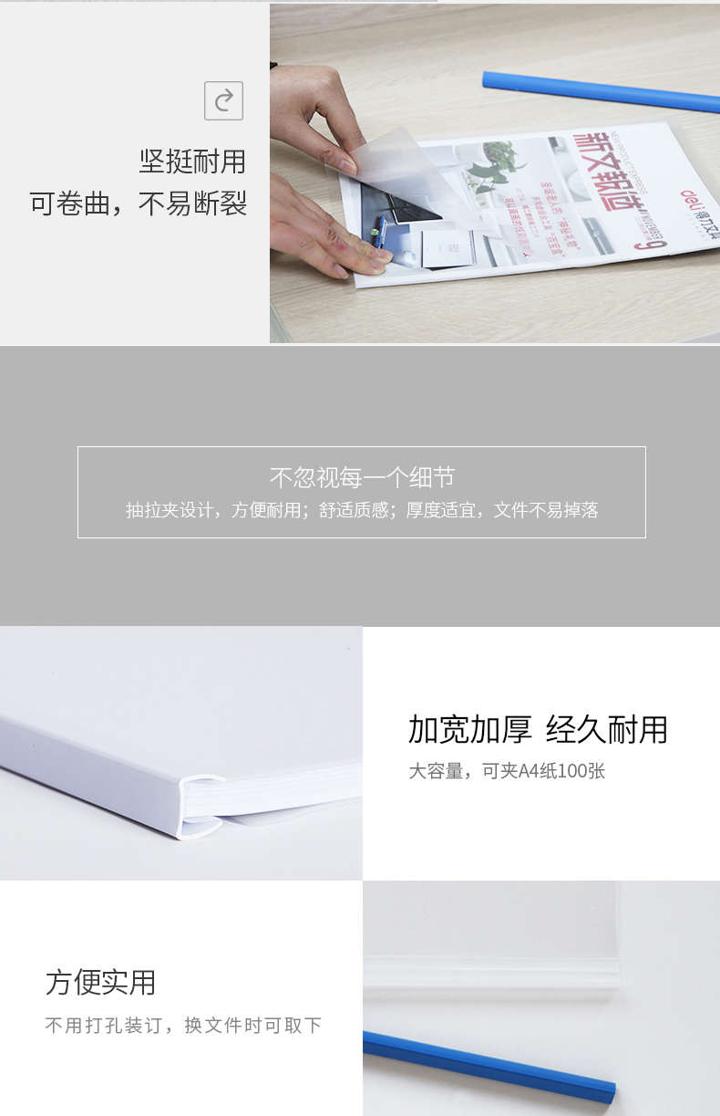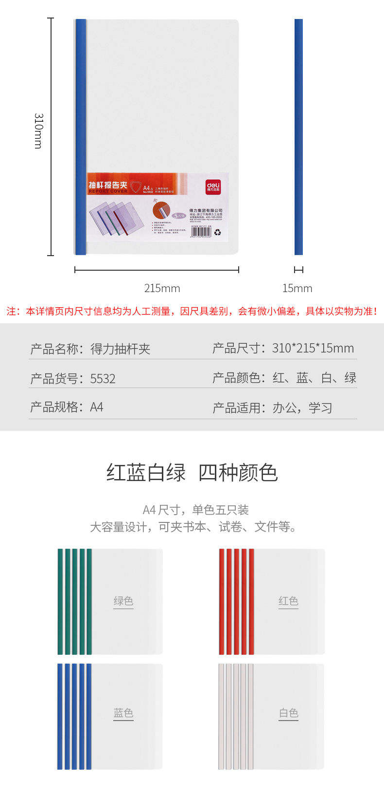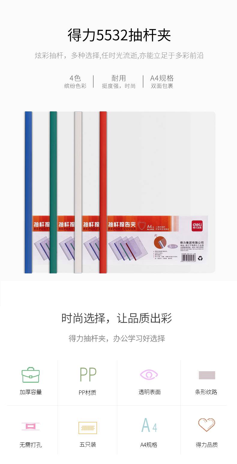 商品名称:得力(deli)5只加宽A4抽杆文件夹报告夹资料夹 5532 白色