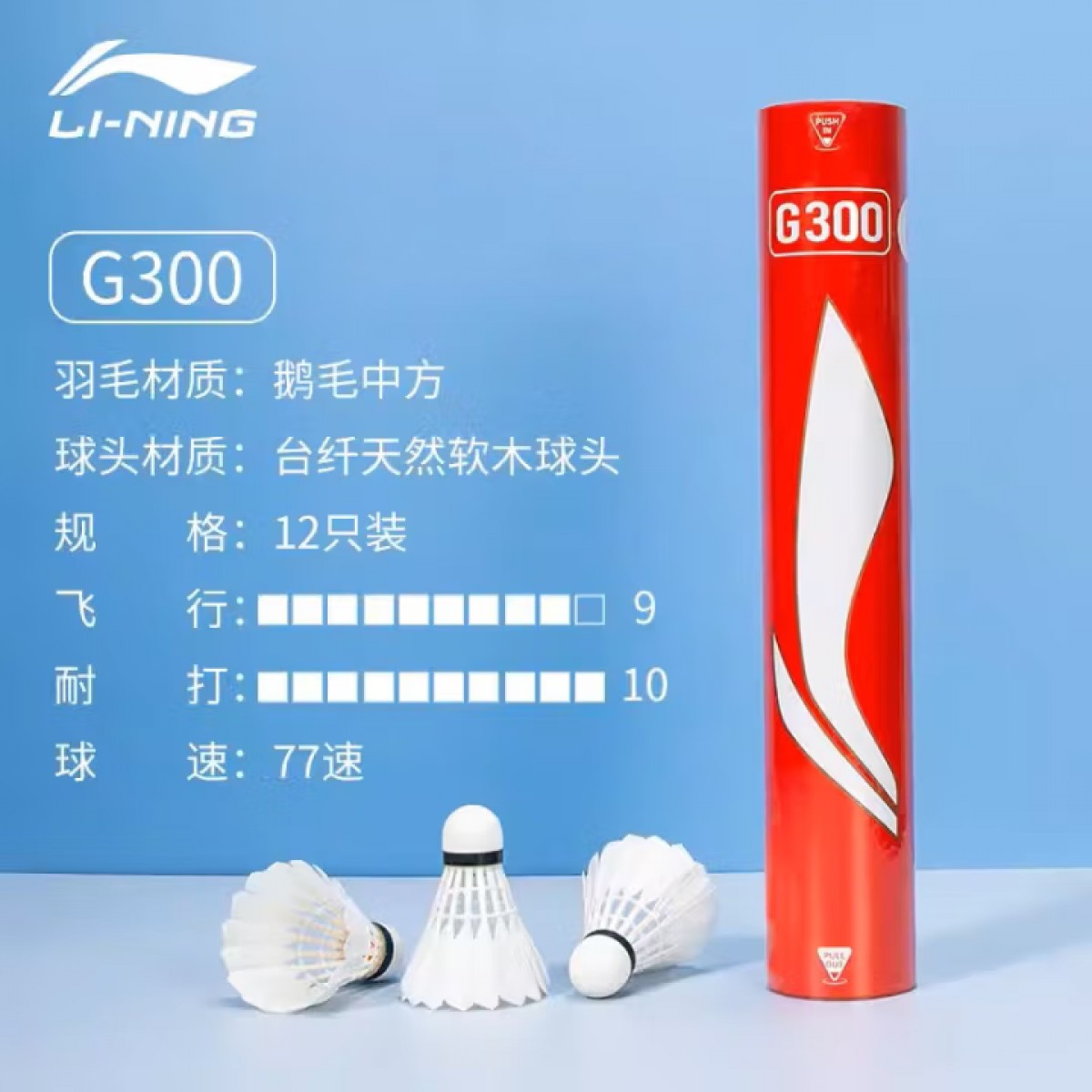 商品名称:李宁 G300 羽毛球 鹅毛材质 77速 白色 单位:筒