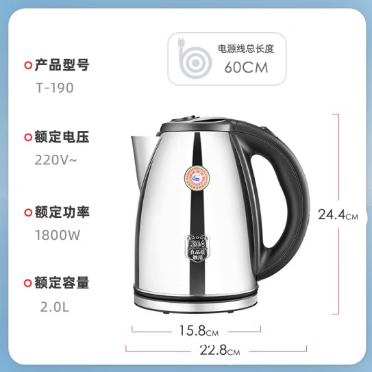 商品名称:金灶T-190电热水壶2升大容量烧水壶 单位:个