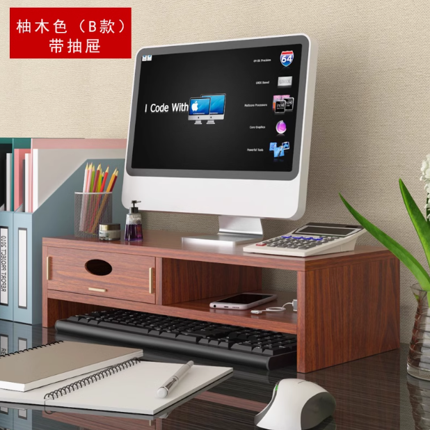商品名称:辉客映上 显示器增高架B款 屏幕垫高底座办公室桌面收纳盒 柚木色 带抽屉(单位:个)