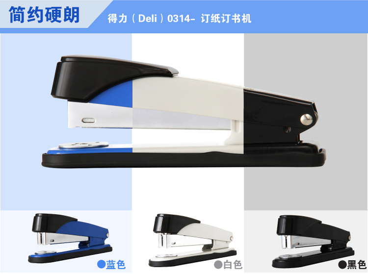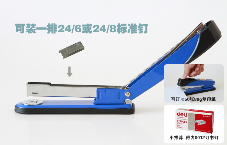 最大订纸张数为50张80克复印纸,最大装订数为150枚;适用于24/6和24/8钉。外观美观大方、结构紧凑。