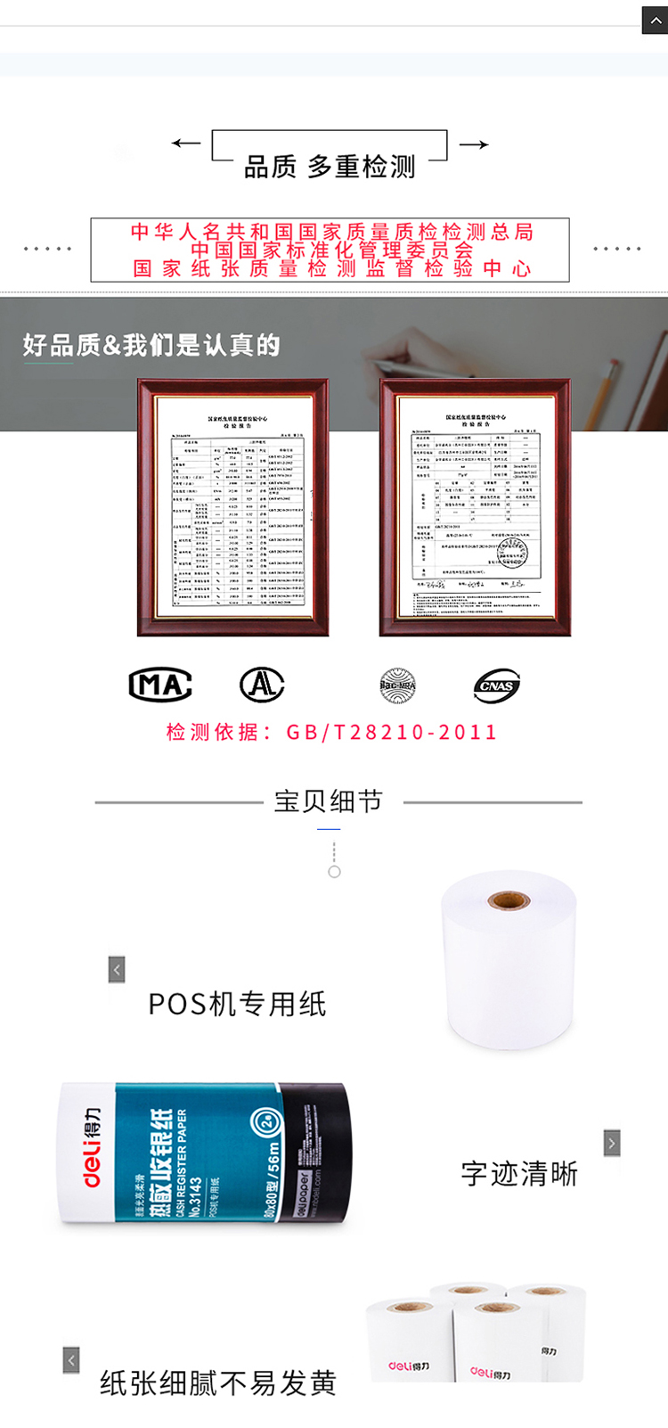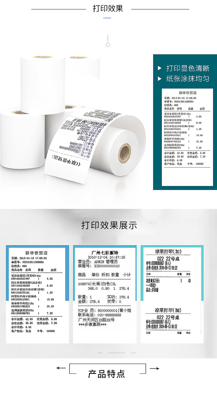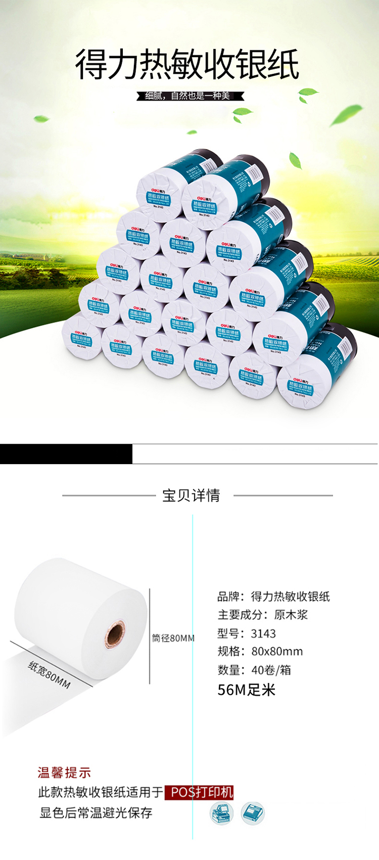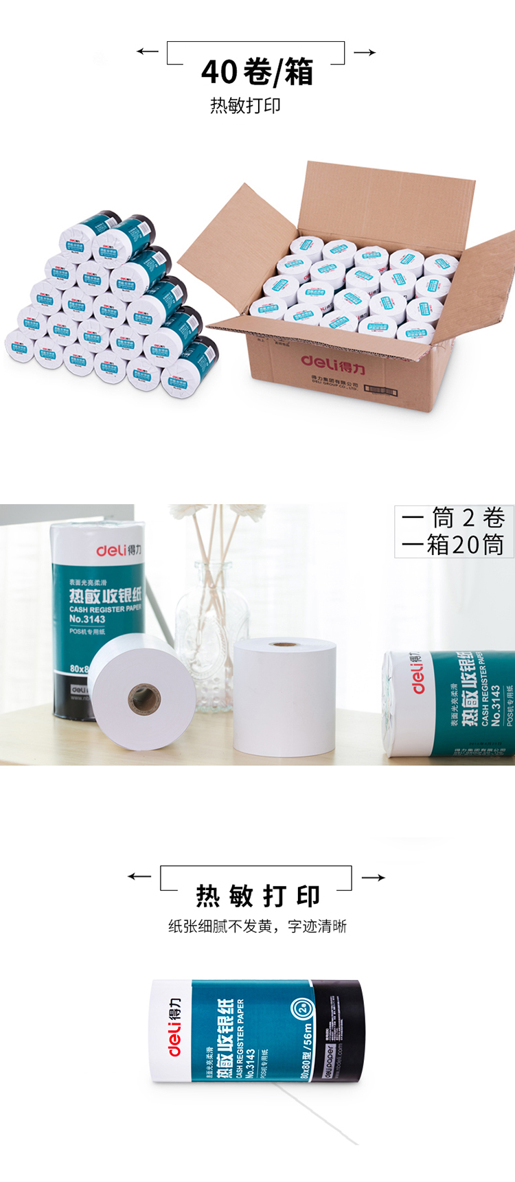 商品名称:得力3143多瑙河热敏收银纸80*80型(混)(2卷/筒) 单位:筒