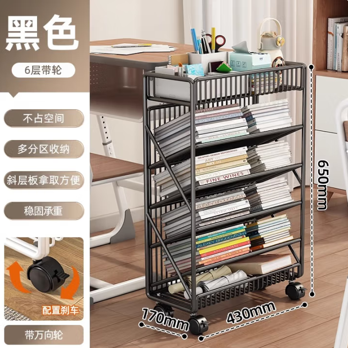 商品名称:优勤可移动书架 6层黑色带轮带侧杆 单位:个