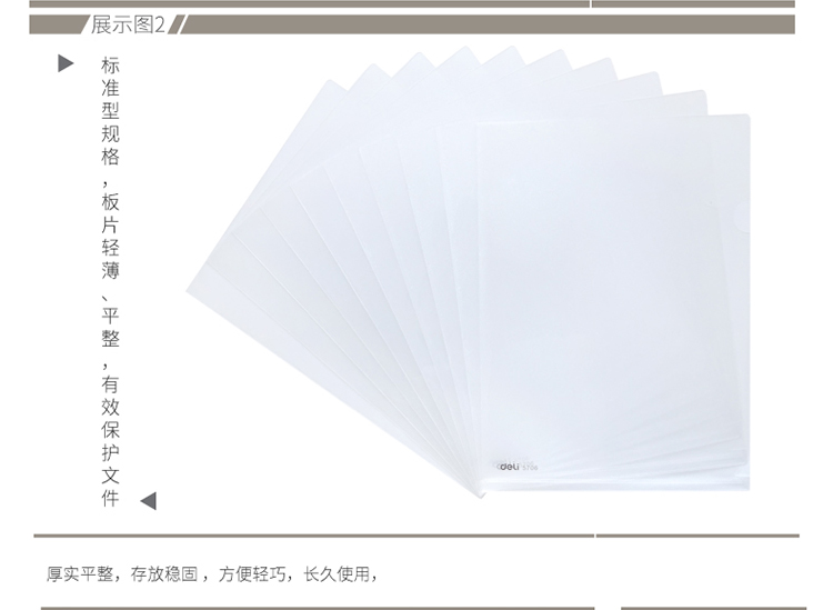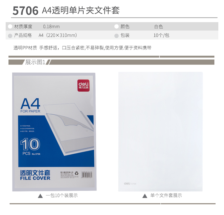 商品名称:得力A4透明单片夹5706