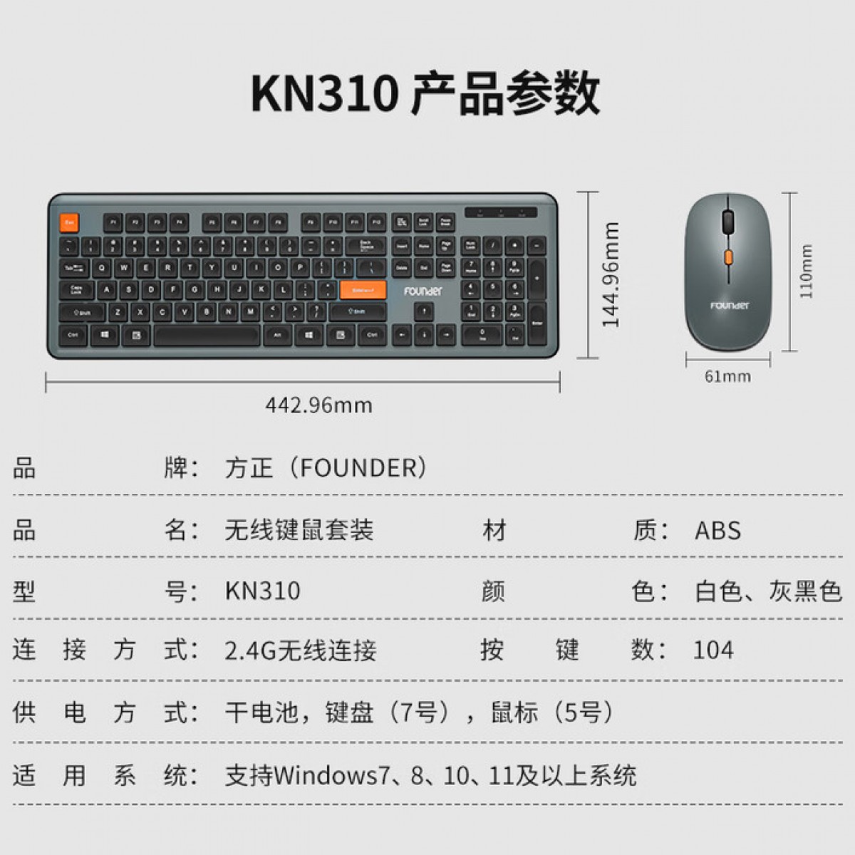 商品名称:方正KN310无线键鼠套装 曜石黑 单位:套