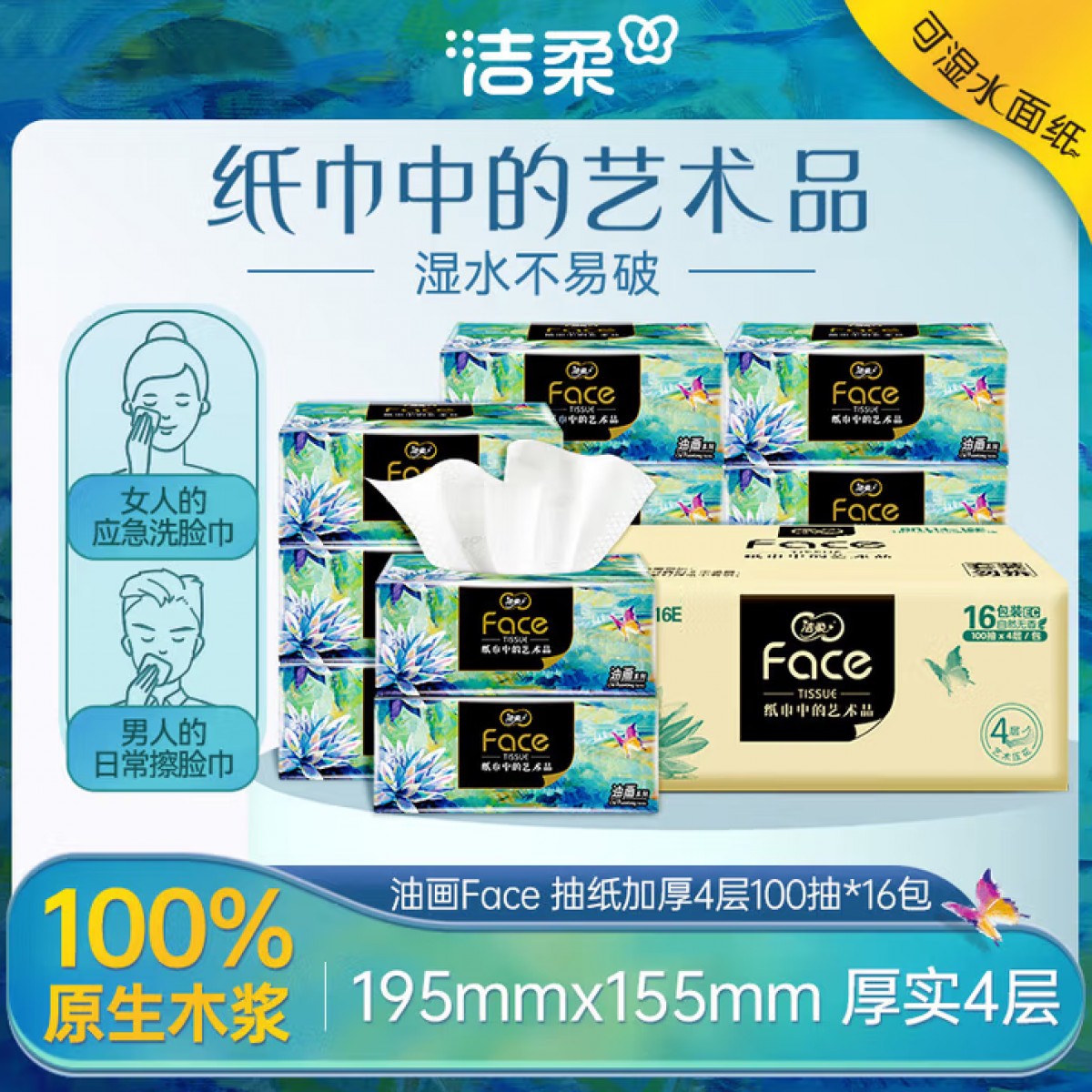 洁柔BR114-16E油画Face软包抽纸 100抽/包 16包/箱 单位:箱
