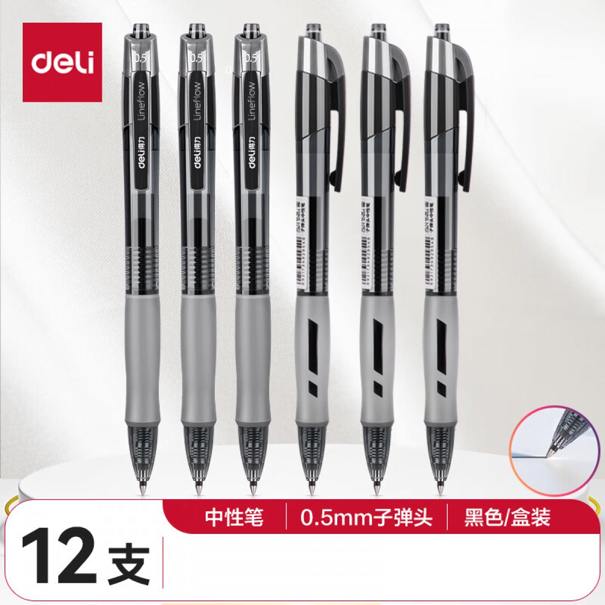 商品名称:得力S08中性笔0.5mm弹簧头(黑色) 12支/盒 单位:盒