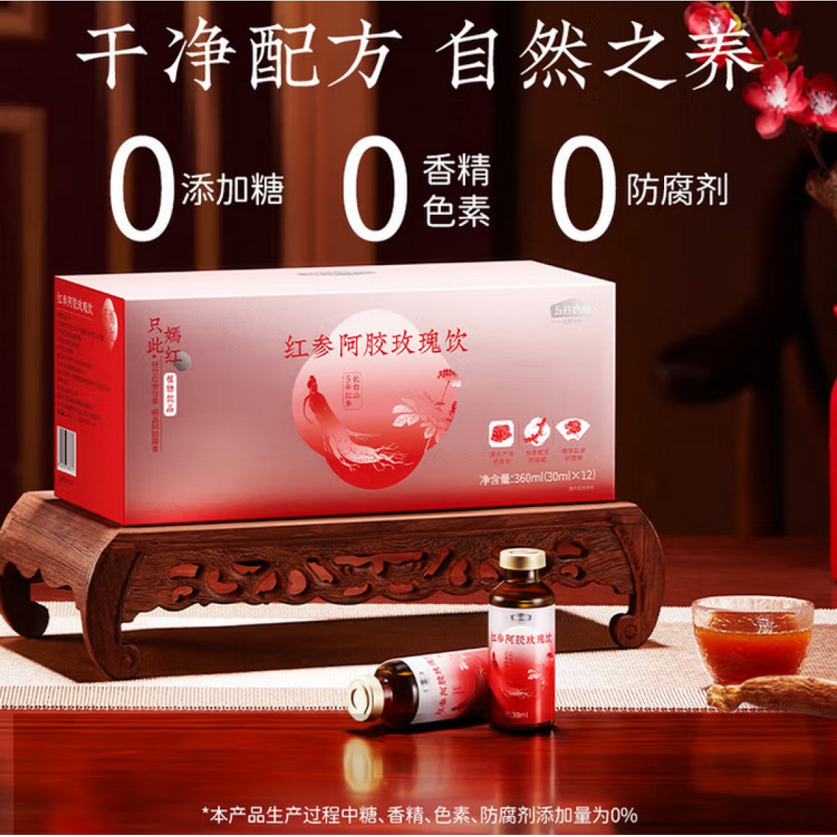 商品名称:五谷磨房养红参阿胶玫瑰饮 30ml 12瓶/盒 单位:盒