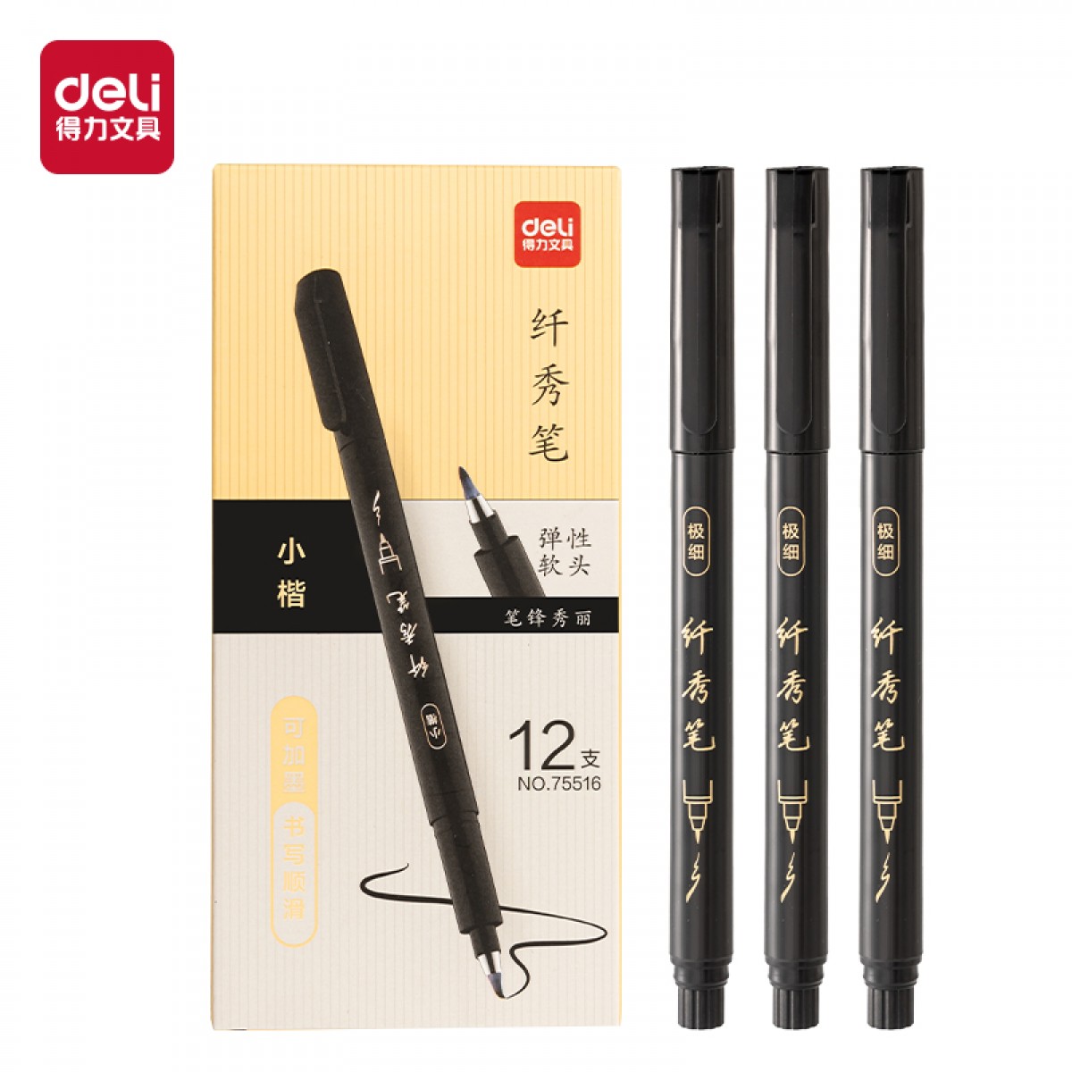 得力75516纤秀笔(小楷)(黑色)12支/盒 单位:盒