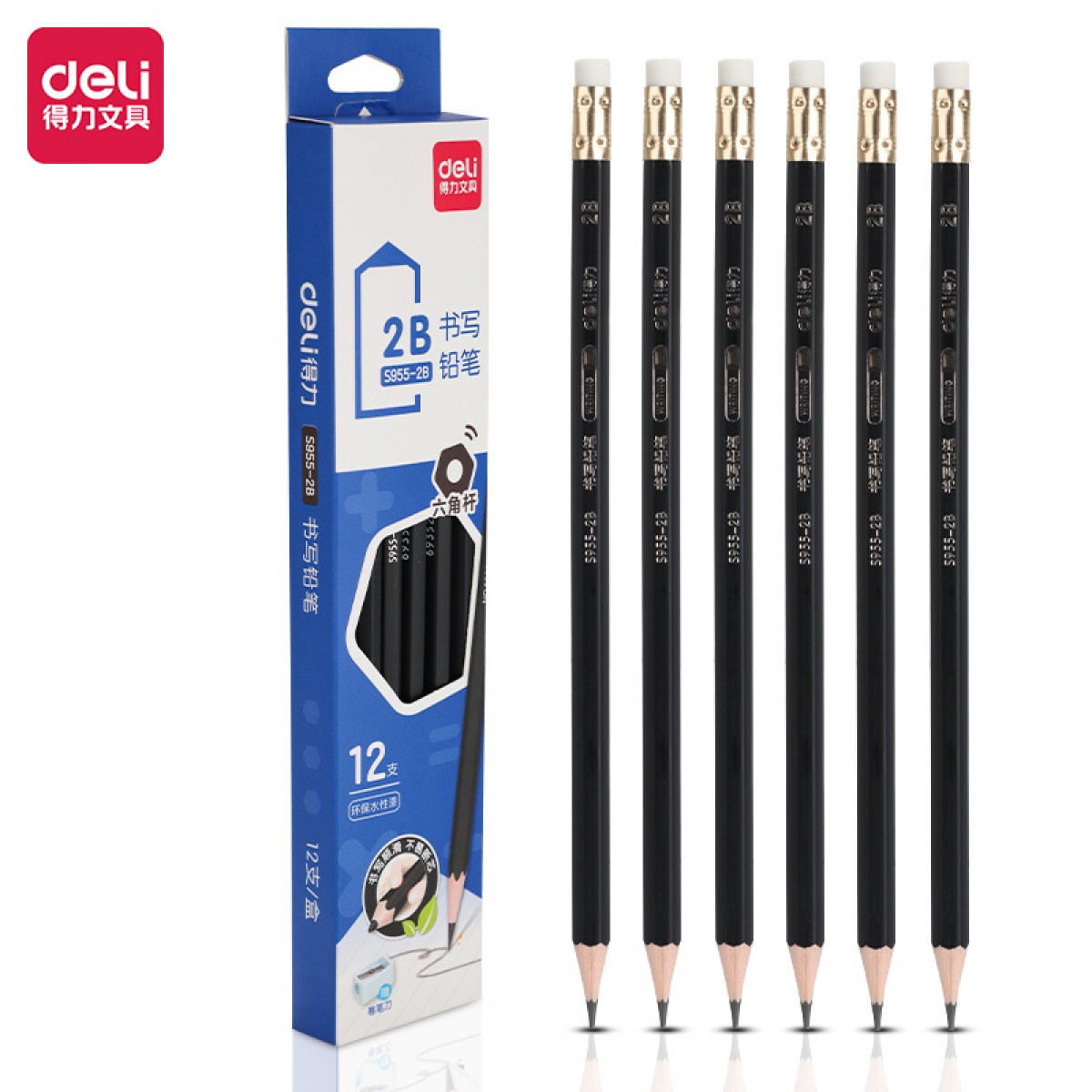 得力S955-2B_黑杆办公皮头2B铅笔(黑)(12支/盒) 单位:盒