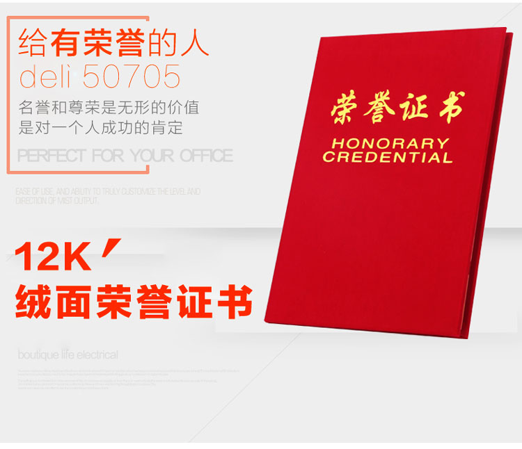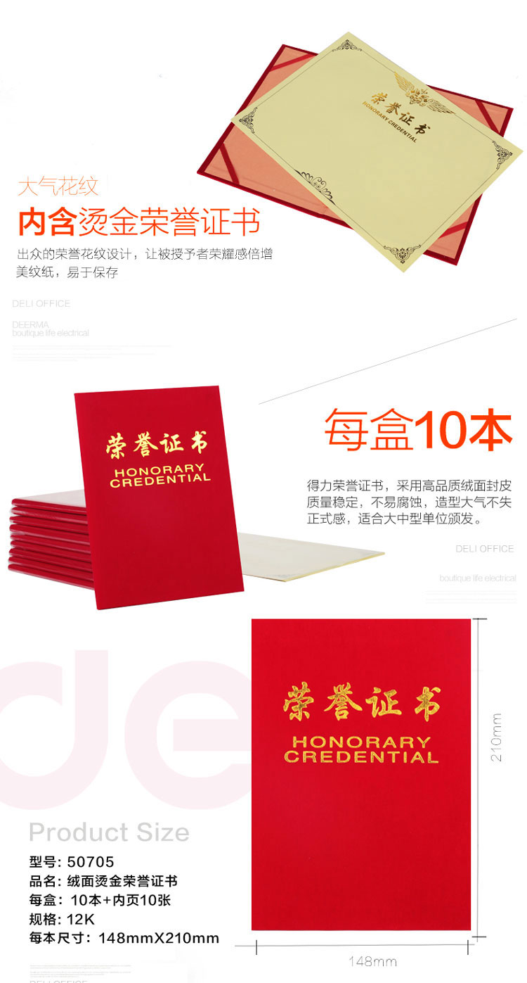 商品名称:得力(deli)10本12K绒面荣誉证书附赠内芯 50705