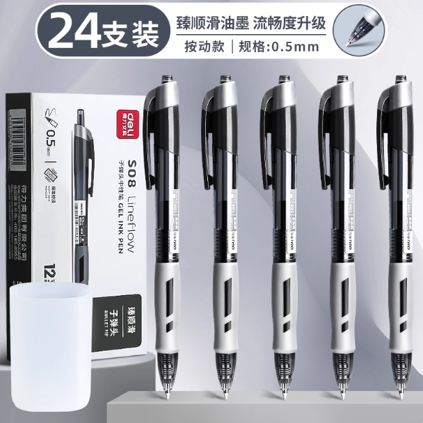 得力S08按动中性笔套装 黑色0.5mm 24支+笔筒 单位:套