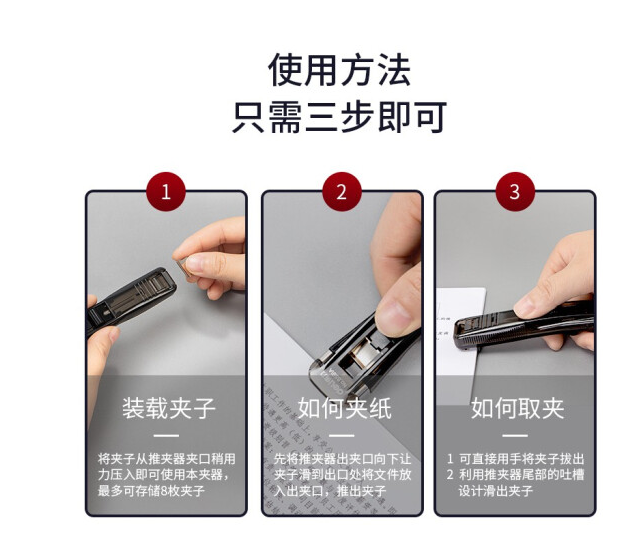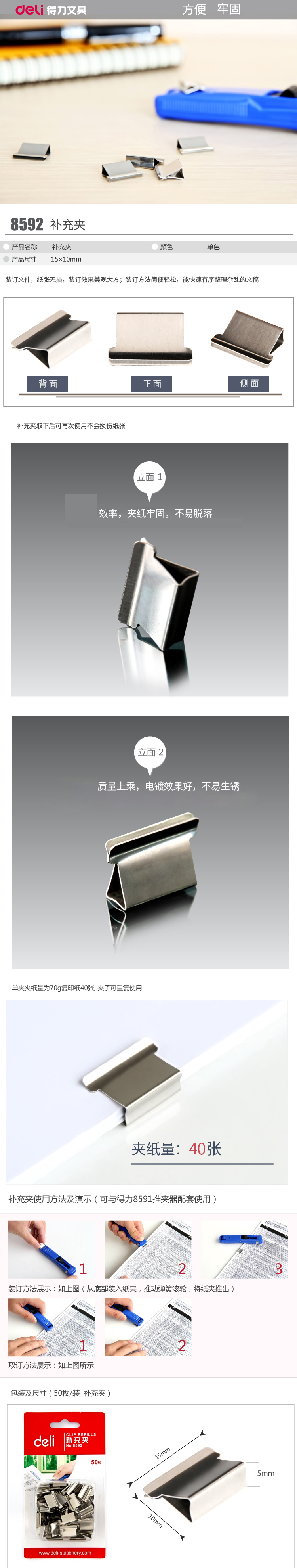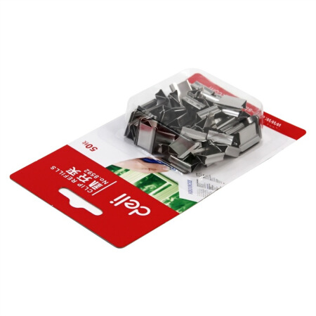 商品名称:得力8592推夹器夹纸器补充夹子 50枚/盒 银色