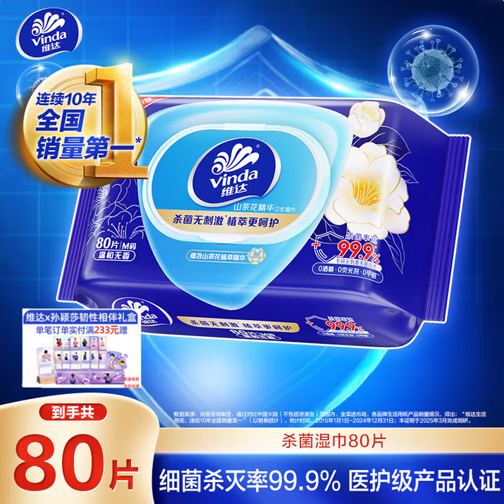 商品名称:维达VW1007杀菌湿巾 80片/包 单位:包