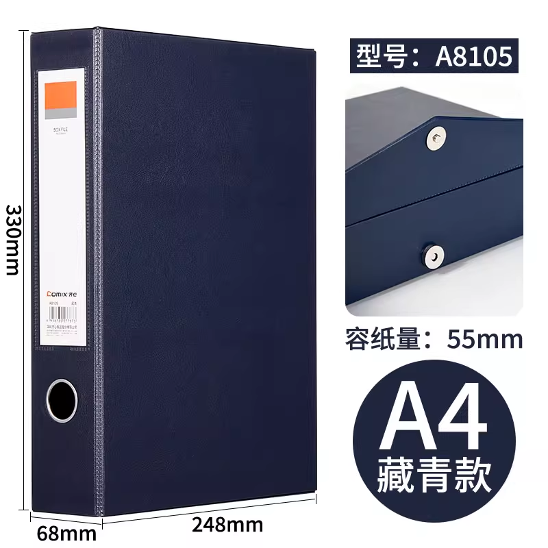 商品名称:齐心A8105磁扣式档案盒 A4藏青色 单位:个