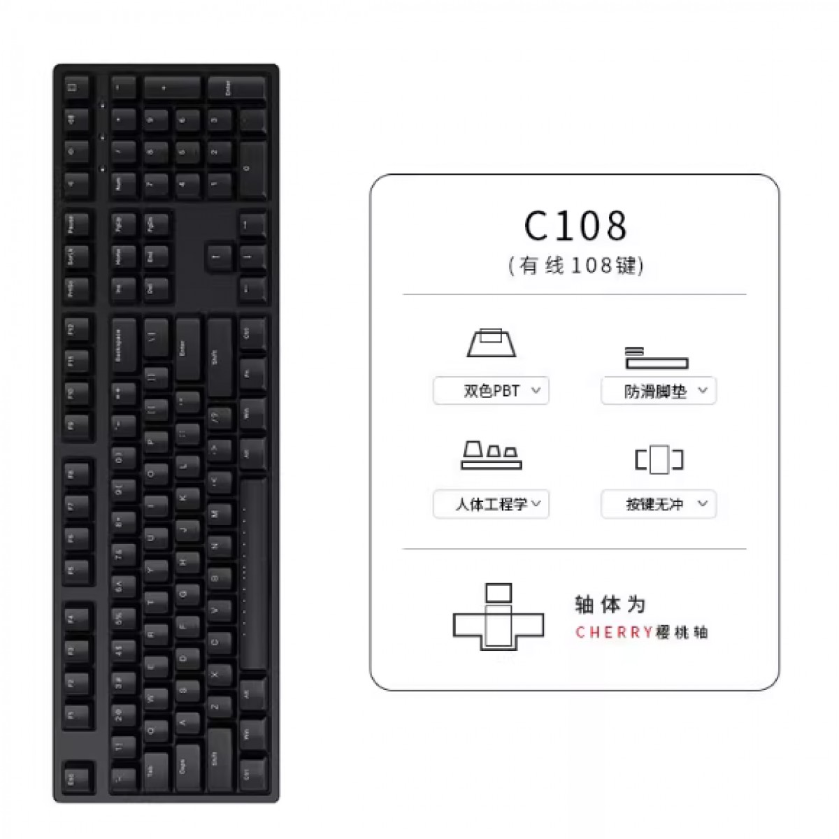 商品名称:ikbc C108有线机械键盘 黑色108键青轴 单位:个
