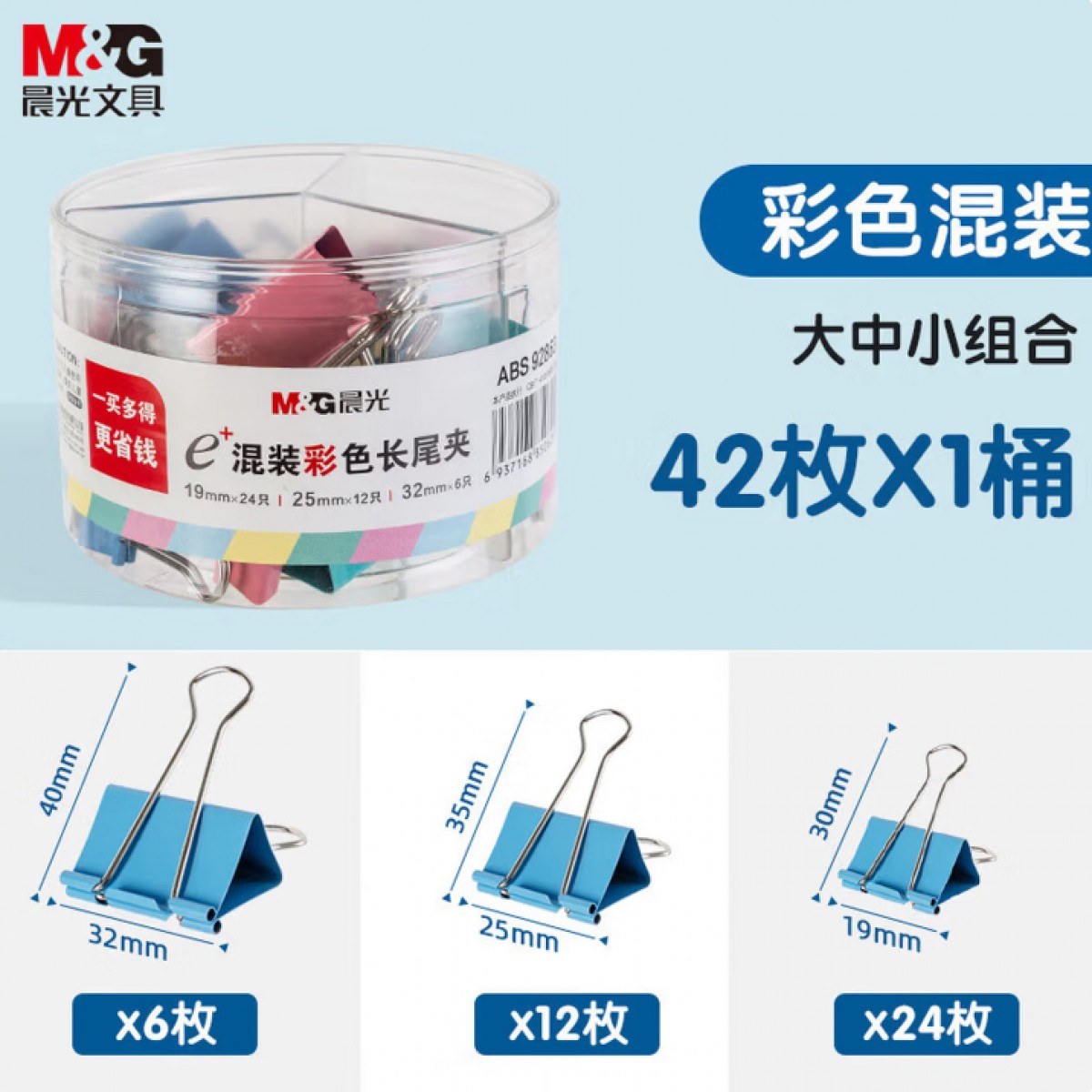 商品名称:晨光ABS92863多规格彩色长尾夹混装 42枚/筒 单位:筒