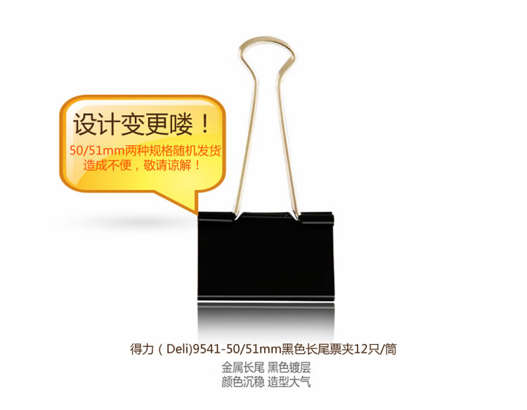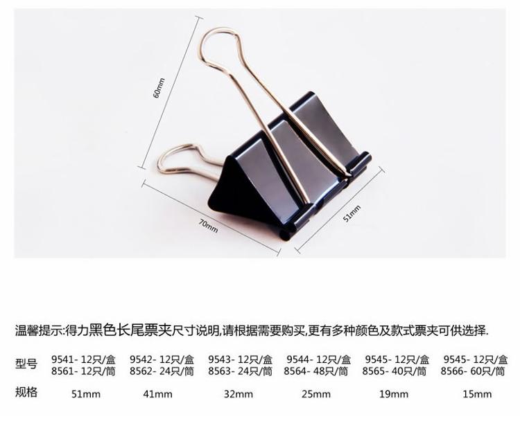 产品信息 Product Information 得力(DeLi)51mm黑色长尾票夹9541 12只/盒简约造型,实用美观金属长尾,黑色镀层最大夹纸范围:25mm得力出品,耐用温馨提示 Kindly Remind 品牌介绍 Brand Introduction